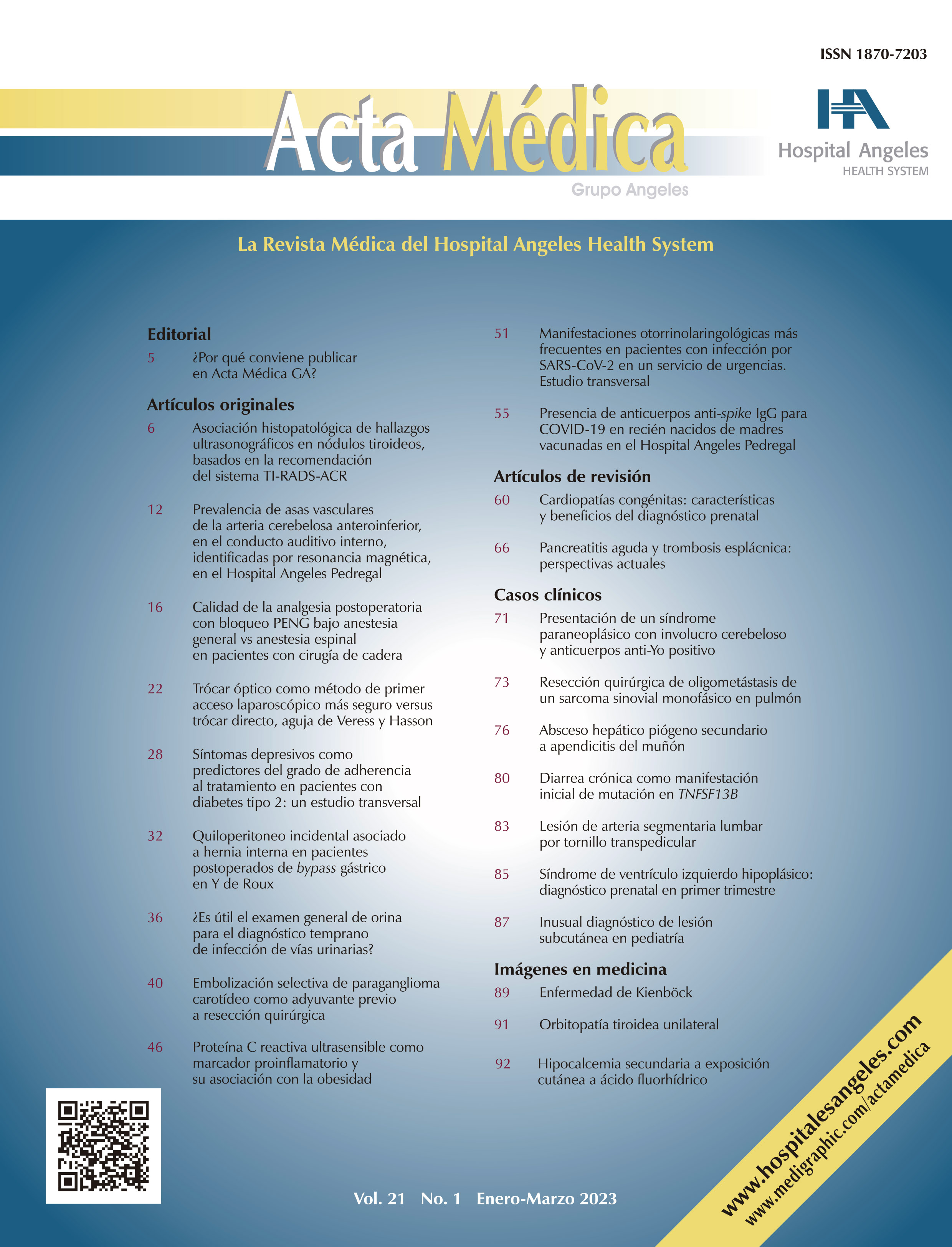 Acta Médica Grupo Angeles Vol. 21, No. 1, Enero-Marzo 2023. La revista Acta Médica Grupo Ángeles es el Órgano Oficial de Difusión del Hospital Angeles Health System.