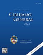 Cirujano General Vol. 45, No. 2, Abril-Junio 2023. Es una publicación trimestral editada por la Asociación Mexicana de Cirugía General. Calzada General Anaya 330. Col. Del Carmen. Del. Coyoacán, Ciudad de México, México. C.P. 04100. http://www.medigraphic.com/cirujanogeneral revista@amcg.org.mx Editor responsable. Dra. Abilene C. Escamilla. Reserva de Derechos al Uso Exclusivo Nº 04-2017-111614180600-203. ISSN Electrónico 2594-1518. Ambos otorgados por el Instituto Nacional del Derecho de Autor. Responsable de la última actualización de este número, Departamento de Internet, Graphimedic, S.A. de C.V., Ing. Luis Rosales Jiménez, Coquimbo 936, Col. Lindavista, Delegación Gustavo A. Madero, C.P. 07300, Ciudad de México, México. Fecha de última modificación, 3 de octubre de 2025.