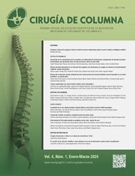 Cirugía de Columna Vol. 4, No. 1, Enero-Marzo 2026. Es una publicación trimestral editada y distribuida por la Asociación Mexicana de Cirujanos de Columna, A.C. Tuxpan 10 201. Col. Roma Sur. Alcaldía Cuauhtémoc. C.P. 06760. Ciudad de México. México. Tel. 55 55743775. http://www.medigraphic.com/cirugiadecolumna, oficina.amcico@gmail.com. Editor responsable. Dr. José María Jiménez Ávila. Reserva de Derechos al Uso Exclusivo 04-2023-042810581600-102; ISSN: 2992-7749. Ambos otorgados por el Instituto Nacional del Derecho de Autor. Responsable de la última actualización de este número, Departamento de Internet, Graphimedic, S.A. de C.V., Ing. Luis Rosales Jiménez. Coquimbo 936. Col. Lindavista, Alcaldía Gustavo A. Madero. C.P. 07300. Ciudad de México, México. Fecha de última modificación, 5 de diciembre de 2025.