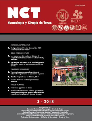 NCT Neumología y Cirugía de Tórax Vol. 77, No. 3, Julio-Septiembre 2018. Es una publicación trimestral editada por la Sociedad Mexicana de Neumología y Cirugía de Tórax. Montecito 38. Piso 32. Oficina 26 Col. Nápoles. Del. Benito Juárez. Ciudad de México, México. C.P. 03810. http://www.medigraphic.com/neumologia smnyct.2015.2016@gmail.com Editor responsable. Dr. Patricio Santillán Doherty. Reserva de Derechos al Uso Exclusivo Nº 04-2017-120714543600-203. ISSN Electrónico 2594-1526. Ambos otorgados por el Instituto Nacional del Derecho de Autor. Responsable de la última actualización de este número, Departamento de Internet, Graphimedic, S.A. de C.V., Ing. Luis Rosales Jiménez, Coquimbo 936, Col. Lindavista, Delegación Gustavo A. Madero, C.P. 07300, Ciudad de México, México. Fecha de última modificación, 23 de abril de 2025.