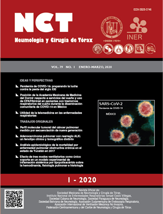 NCT Neumología y Cirugía de Tórax Vol. 79, No. 1, Enero-Marzo 2020. Es una publicación trimestral editada por la Sociedad Mexicana de Neumología y Cirugía de Tórax. Montecito 38. Piso 32. Oficina 26 Col. Nápoles. Del. Benito Juárez. Ciudad de México, México. C.P. 03810. http://www.medigraphic.com/neumologia smnyct.2015.2016@gmail.com Editor responsable. Dr. Patricio Santillán Doherty. Reserva de Derechos al Uso Exclusivo Nº 04-2017-120714543600-203. ISSN Electrónico 2594-1526. Ambos otorgados por el Instituto Nacional del Derecho de Autor. Responsable de la última actualización de este número, Departamento de Internet, Graphimedic, S.A. de C.V., Ing. Luis Rosales Jiménez, Coquimbo 936, Col. Lindavista, Delegación Gustavo A. Madero, C.P. 07300, Ciudad de México, México. Fecha de última modificación, 23 de abril de 2025.