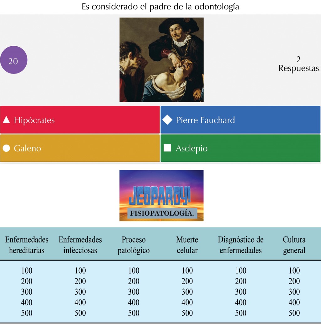 El académico debe explotar su creatividad al máximo para implementar dinámicas lúdicas que favorezcan la interiorización de conocimientos en sus alumnos, ejemplos de esto son juegos, concursos, cuestionarios, misiones o retos que, tras su resolución, se obtenga alguna recompensa, punto, regalo, entre otros. Ejemplos de éstos son concursos virtuales a través de Kahoot, plataforma que permite crear concursos de conocimientos entre alumnos de forma individual o en equipos, a través de preguntas con respuestas de opción múltiple y verdadero o falso elaboradas por el profesor, Socrative que permite responder cuestionarios que refuercen conceptos vistos en clase, la creación de concursos de conocimientos generales de la materia a través de la simulación de un programa de preguntas como "Jeopardy" mediante el uso de Power Point (Figura 1).