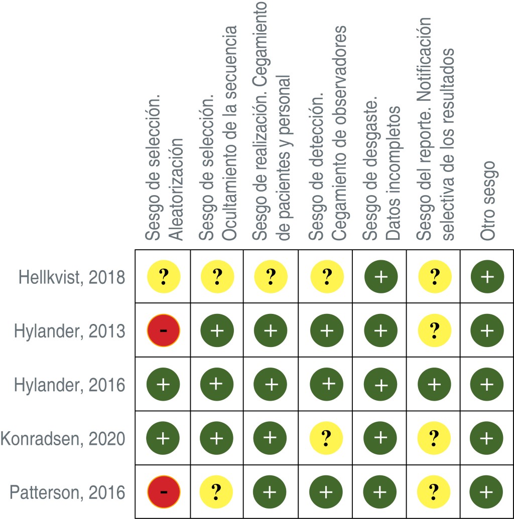 La valoración del riesgo de sesgo con la herramienta Cochrane arrojó los siguientes resultados: en un estudio el riesgo de sesgo fue claro para la mayoría de los criterios,18 se encontró riesgo de selección en dos estudios, pero la mayoría de los criterios restantes fueron evaluados como bajo riesgo de sesgo (Figura 2). Por lo que, en general, los estudios fueron de buena calidad con baja probabilidad de sesgo de ejecución, de detección, de deserción, de notificación y otros sesgos, de acuerdo con los criterios de Cochrane (Figura 3).14