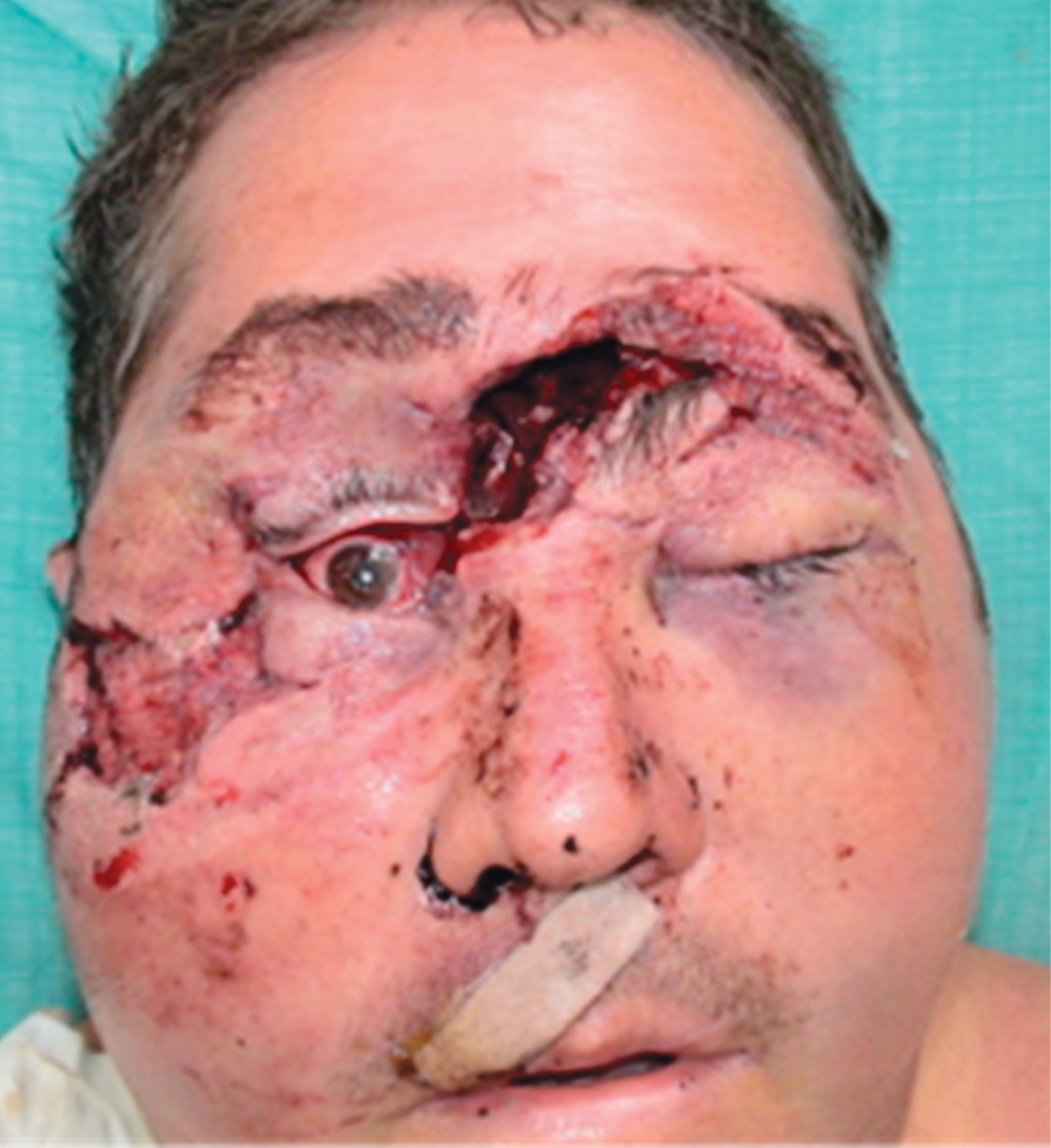 El paciente fue llevado a quirófano de emergencia para exploración y limpieza quirúrgica de las heridas, mediante lavado, irrigación y desbridamiento. Se extrajeron piezas dentarias libres y se colocaron sólo algunos puntos de afrontamiento de las heridas. En el intraoperatorio se evidenció la movilización del complejo facial compatible con una disociación craneofacial.