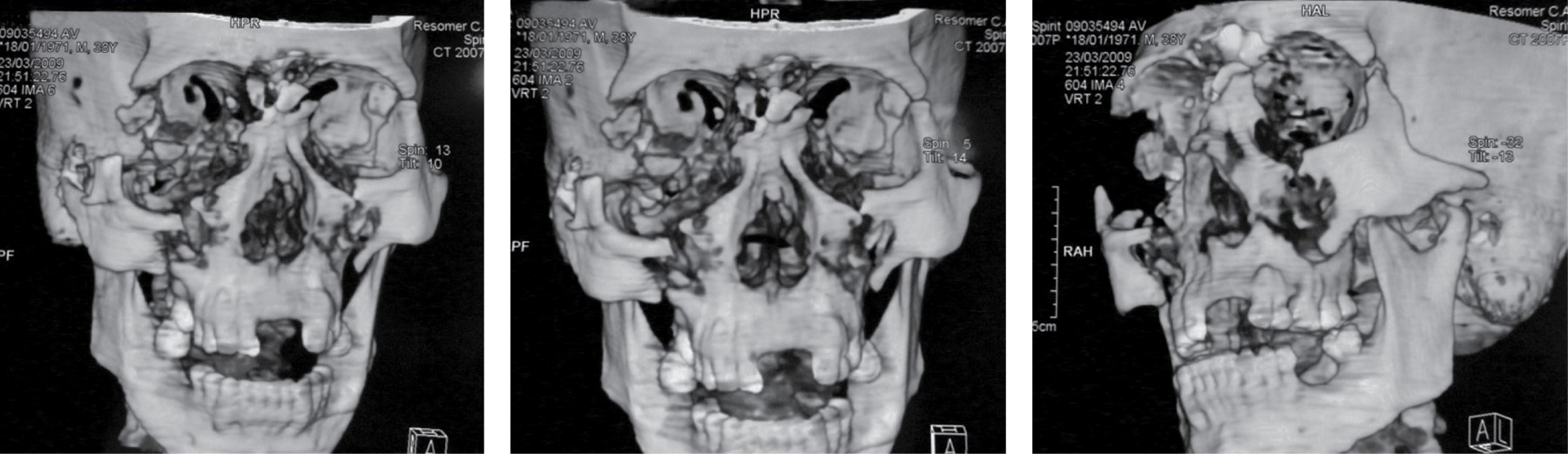 Todo esto nos permitió lograr la reconstrucción anatómica ósea tridimensional del tercio medio de la cara, de acuerdo con las medidas antropométricas previas al traumatismo del paciente, con una mínima secuela estética y en un único tiempo quirúrgico.