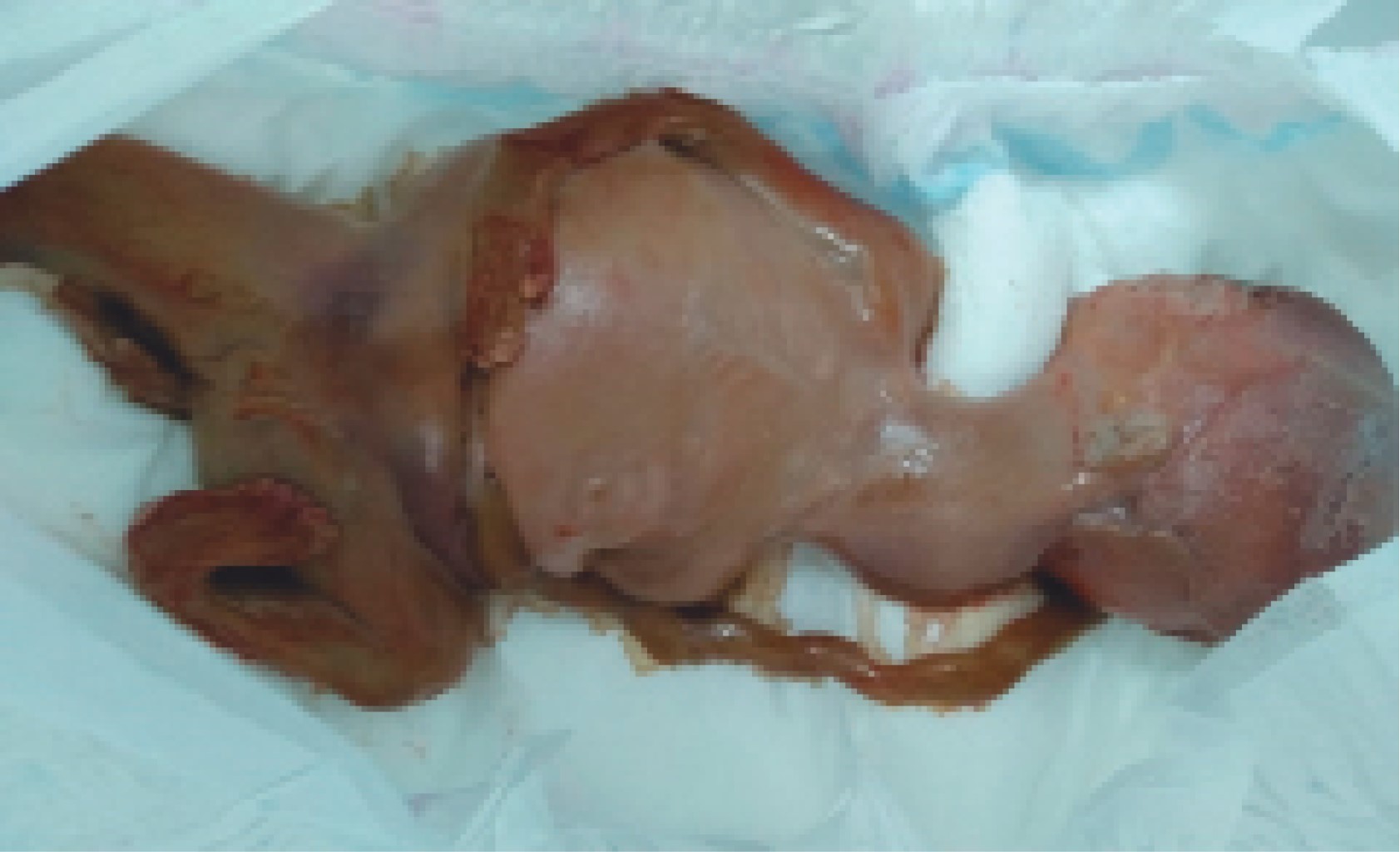 Se presenta al Servicio de Urgencias el 15 de mayo de 2019 con un embarazo de 20.4 semanas de gestación, sin control prenatal, acude al ser referida por médico particular con diagnóstico de muerte fetal temprana. Mediante rastreo ultrasonográfico se encuentra producto sin actividad cardiaca; a la exploración física se encuentra deformidad de mandíbula, acortamiento de cuello (Figura 1), abdomen globoso a expensas de útero gestante, fondo uterino de 20 cm, con frecuencia cardiaca fetal no audible, al tacto vaginal cérvix central blando dehiscente, acortamiento de miembro pélvico izquierdo, ensanchamiento a nivel de tercio superior de fémur izquierdo (Figuras 2 y 3), con los siguientes paraclínicos: hemoglobina 14.5 g/dL, plaquetas 210 × 103/mm3, leucocitos 7.40 × 103/L, glucosa 87 mg/dL, creatinina 0.30 mg/dL, ácido úrico 2.2 mg/dL, grupo sanguíneo "B" Rh positivo. Ingresa al Servicio de Tococirugía, donde previo consenso, se decidió propiciar el nacimiento a través de una inducción para un parto vaginal, obteniendo un producto masculino con peso de 160 g, con las siguientes deformidades: tórax en barril, fémur izquierdo en acordeón (Figura 4). Posteriormente, por decisión de la paciente, se realiza salpingoclasia bilateral bajo anestesia subaracnoidea, sin complicaciones. No se reportaron complicaciones en el parto, en el transquirúrgico ni en el puerperio inmediato. La paciente se egresó al segundo día de estancia intrahospitalaria.