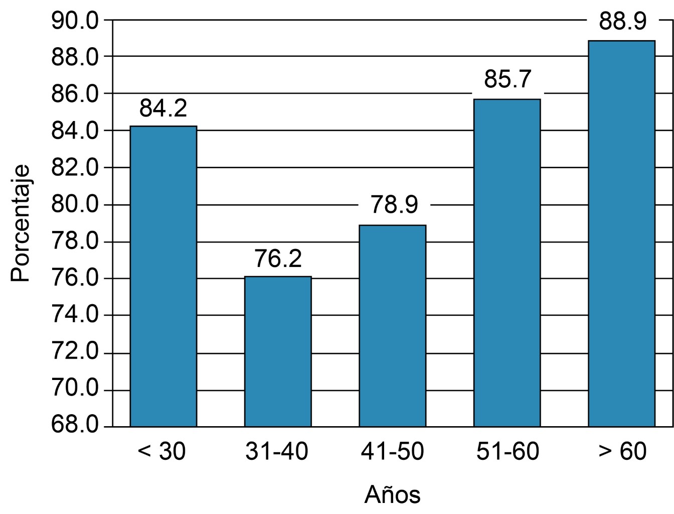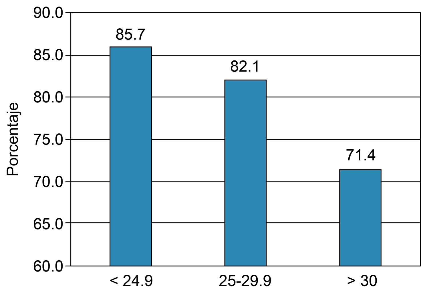 Identificamos un patrón de mayor intensidad sin alcanzar diferencias significativas en la EVA de intensidad del prurito medido de forma lineal a medida que aumentan la edad (p = 0.14) y el IMC (p = 0.34), con una prevalencia que oscila entre 76.2 a 88.9%, y sin diferencias al comparar entre los grupos etarios (p = 0.83) o grupos del IMC (p = 0.44). Estas comparaciones se detallan en las Figuras 1, 2 y 3. Las variables asociadas a prurito grave fueron la edad (42.4 vs 49.7, p = 0.021), el peso (61.2 vs 66.7, p = 0.05) y el IMC (23.8 vs 25.9, p = 0.019) (Figura 3). Por otro lado, no se observó correlación entre las variables que miden intensidad y frecuencia de prurito y los estudios de laboratorio. La comparación de las variables relevantes, incluidos los resultados de laboratorio, se detallan en la Tabla 2. El análisis multivariado reveló que las variables asociadas a prurito grave fueron la presencia de prurito diseminado OR = 17.2 (IC95% 1.039-286.6, p = 0.047), IMC ≥ 24 OR = 3.37 (IC95% 1.008-11.29, p = 0.049), despertares OR = 10.9 (IC95% 2.21-53.87, p = 0.003) (Tabla 3).