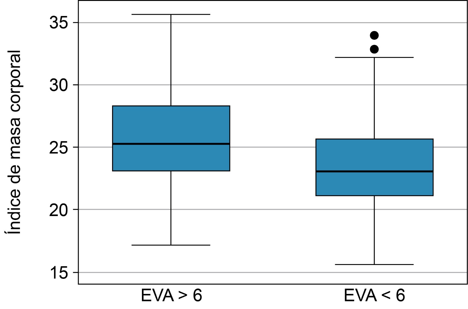 Análisis estadístico: utilizamos estadística descriptiva con medidas de tendencia central y de dispersión; las variables categóricas fueron expresadas como medidas de frecuencia absoluta y relativa y las variables lineales como media y desviación estándar (DE); para las variables con distribución normal o medianas con rangos intercuartílicos (RIQ) de acuerdo al tipo de distribución de frecuencias. Las variables numéricas fueron comparadas con la prueba t de Student para muestras independientes o la de U de Mann-Whitney de acuerdo con las características de la distribución. Las variables fueron comparadas con χ2 o prueba exacta de Fisher. La medida de fuerza de asociación para estudios trasversales con Odds Ratio (OR) con intervalos de confianza del 95%. El análisis multivariado incluyó la construcción de modelos de regresión logística binaria en el que la variable dependiente fue la presencia de prurito con un puntaje de EVA > 6 puntos. Un error alfa ajustado menor de 5% a dos colas fue considerado significativo. El paquete estadístico fue STATA SE v 11.0.