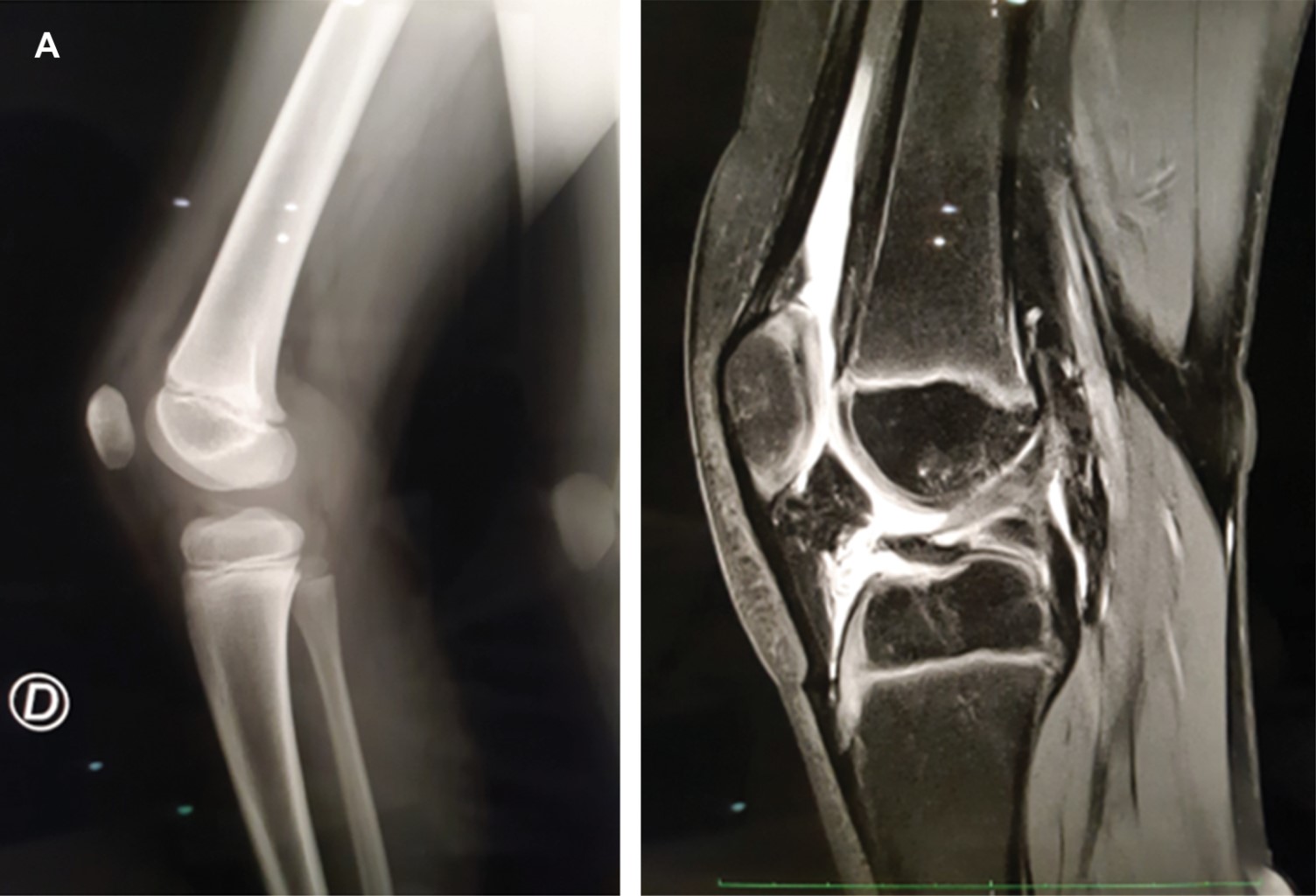 Paciente masculino de 11 años que acude a valoración tras presentar caída mientras jugaba en un brincolín, con lo que desarrolla dolor y aumento de volumen de rodilla derecha así como equimosis leve y limitación para el apoyo con la extremidad. Se realizan estudios de imagen (Figuras 1 y 2), entre ellos radiografía de ambas rodillas en la que se describe irregularidad de la meseta tibial de rodilla derecha, compatible con avulsión de la espina tibial. La tomografía computarizada mostró fractura de meseta tibial en topografía de inserción de ligamento cruzado anterior. La resonancia magnética reporta fractura por avulsión de la apófisis espinosa anterior de la tibia, y zonas de contusión ósea con lesión osteocondral grado 1-2 de cóndilo femoral lateral y plataforma tibial, además de meniscopatía intrasustancia medial grado 2.