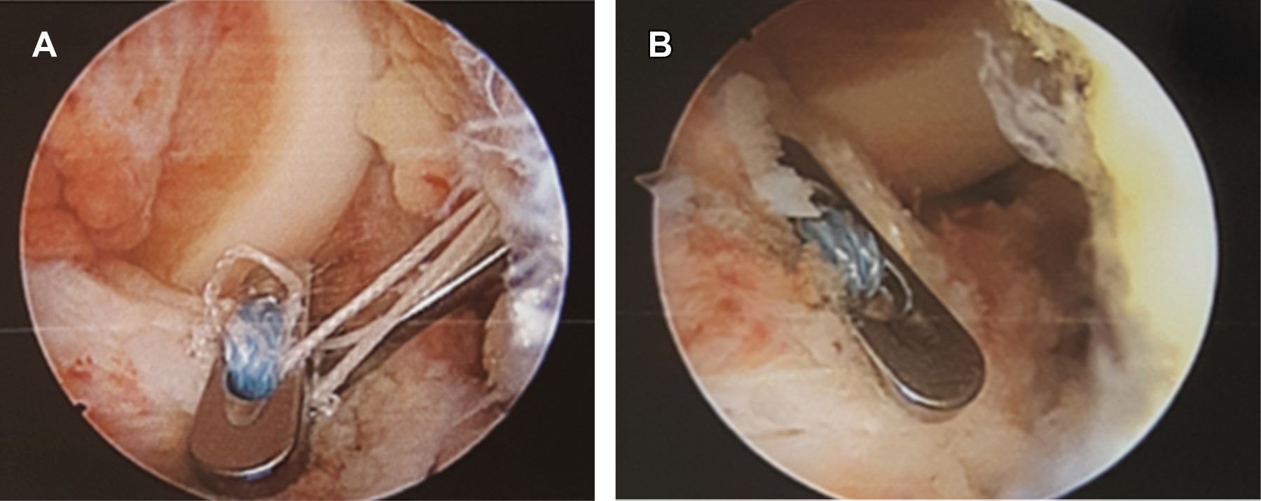 Entre las técnicas descritas se encuentra el uso de clavillos de Kirshner percutáneos, fijación con tornillos guiados por artroscopia, grapas y el uso del sistema TightRope.3,4,6 Muchos de estos procedimientos requieren de una segunda intervención para el retiro de material, además de asociarse a complicaciones como fatiga del implante, aflojamiento o migración, infección y ausencia de consolidación.4,6 Se ha encontrado además en un estudio en cadáveres que la fuerza de fijación con sutura FiberWire es mayor que la de fijación con tornillos.4