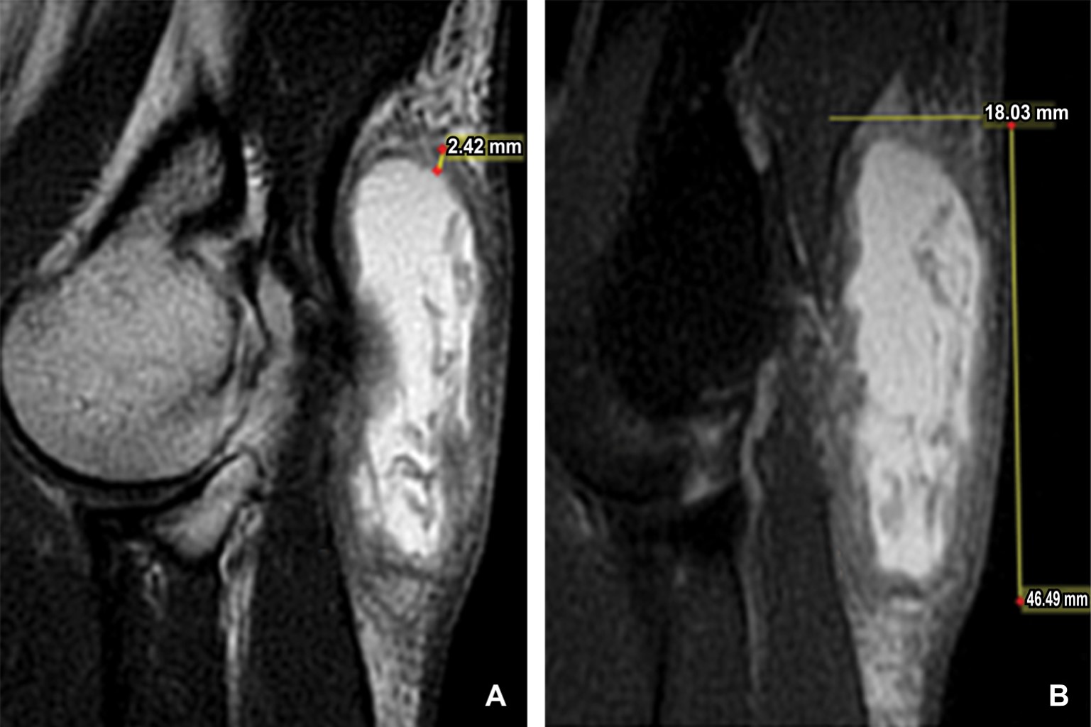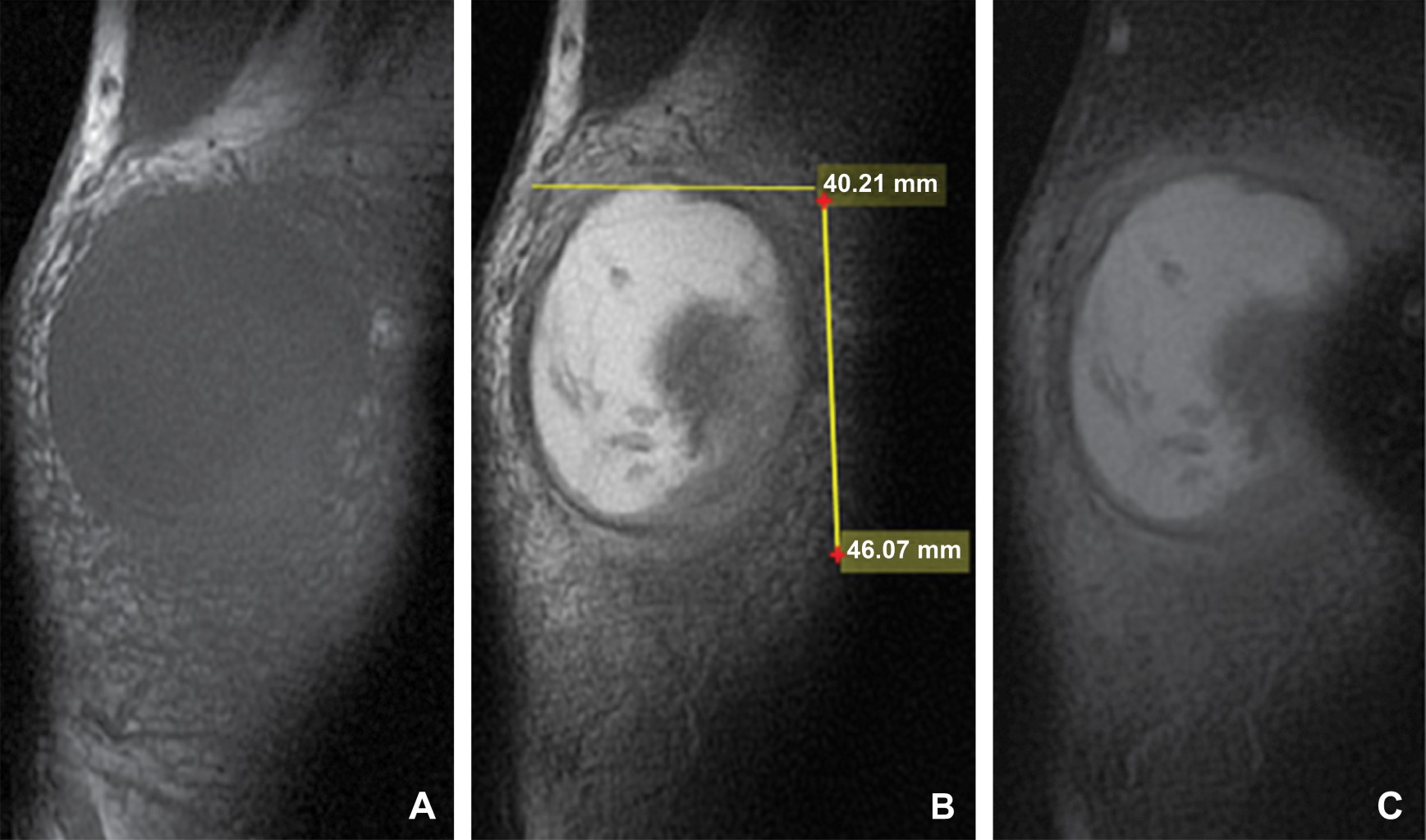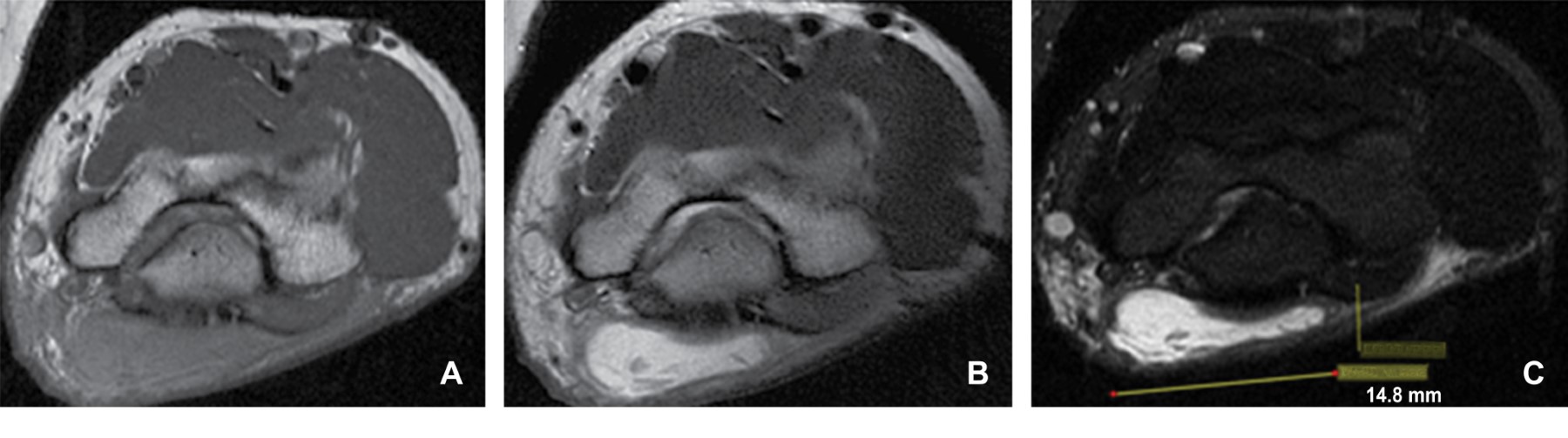 Masculino de 40 años de edad que refiere aparición de zona de enrojecimiento y pequeño abultamiento a nivel del codo izquierdo de tres semanas de evolución, inicialmente adjudicada a piquete de insecto. Acude a médico particular que le administra tratamiento antibiótico sin mejoría, por lo que acude a una segunda evaluación médica donde a la exploración física se evidencia un notable aumento de volumen en región olecraneana, de consistencia blanda con eritema, razón por la que su médico decide investigar a fondo y solicita estudios de laboratorio, los cuales revelaron una elevación de los niveles séricos de ácido úrico y se diagnosticó con gota, por tal motivo se solicita resonancia magnética de codo izquierdo. En el estudio de resonancia magnética simple se identifica una imagen sacular a nivel del olecranon, bien delimitada, heterogénea en su interior, de comportamiento isointenso heterogéneo en el T1, hiperintenso heterogéneo en el T2 e hiperintenso heterogéneo en el T2 con saturación grasa. Dicha imagen midió 39.8 × 14.8 mm en el plano axial, 18 × 46.5 mm en el plano sagital y 40.21 × 46.07 mm en el plano coronal (Figuras 1, 2 y 3), con una pared que midió 2.42 mm de grosor (Figura 2); localizada a nivel de las bursas del olécranon en específico a nivel de la bursa olecraneana superficial.