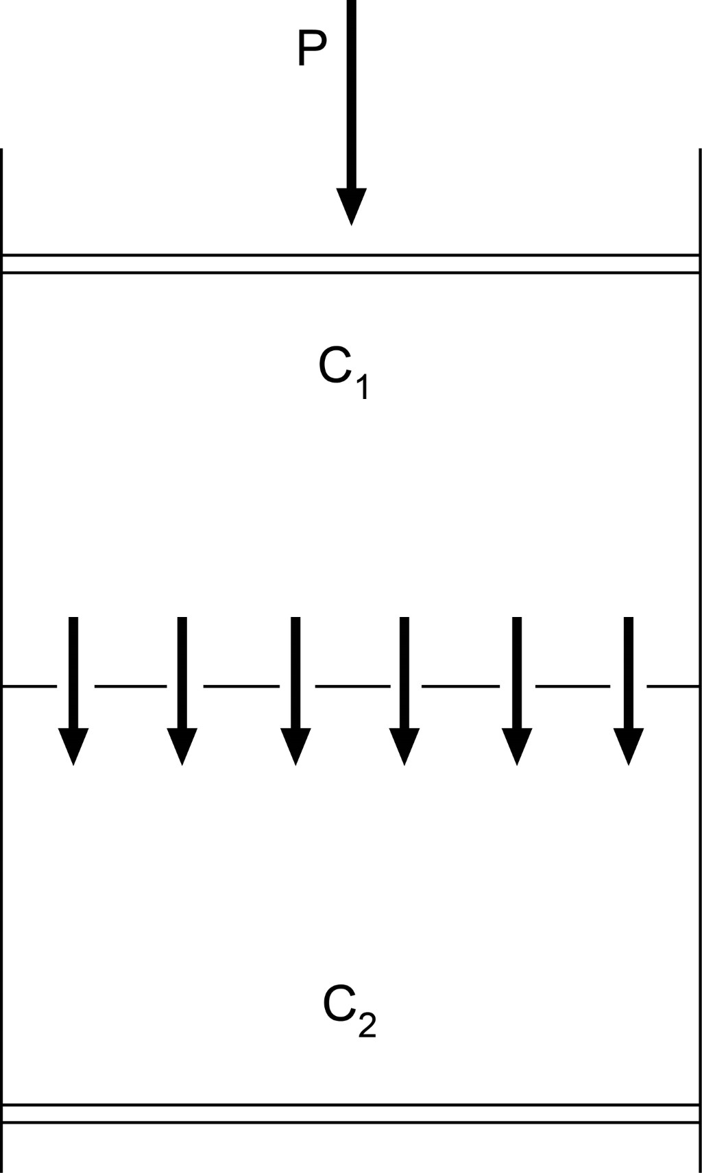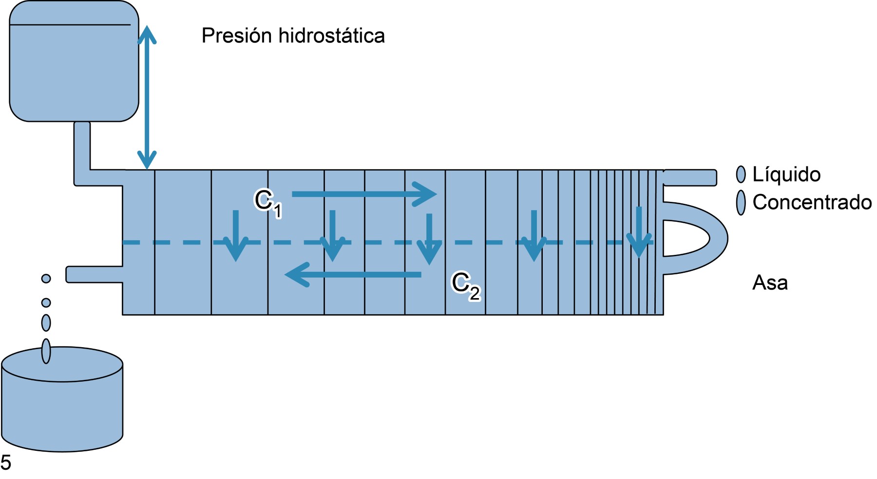 La Figura 5 ejemplifica un clásico osmómetro, en que al aplicar presión en el compartimiento C1, pasa solvente al C2, el primero se concentra y el C2 se diluye, o sea, el efecto de la presión hidrostática es que substrae solvente de un lado (C1) y lo suma en el otro (C2).