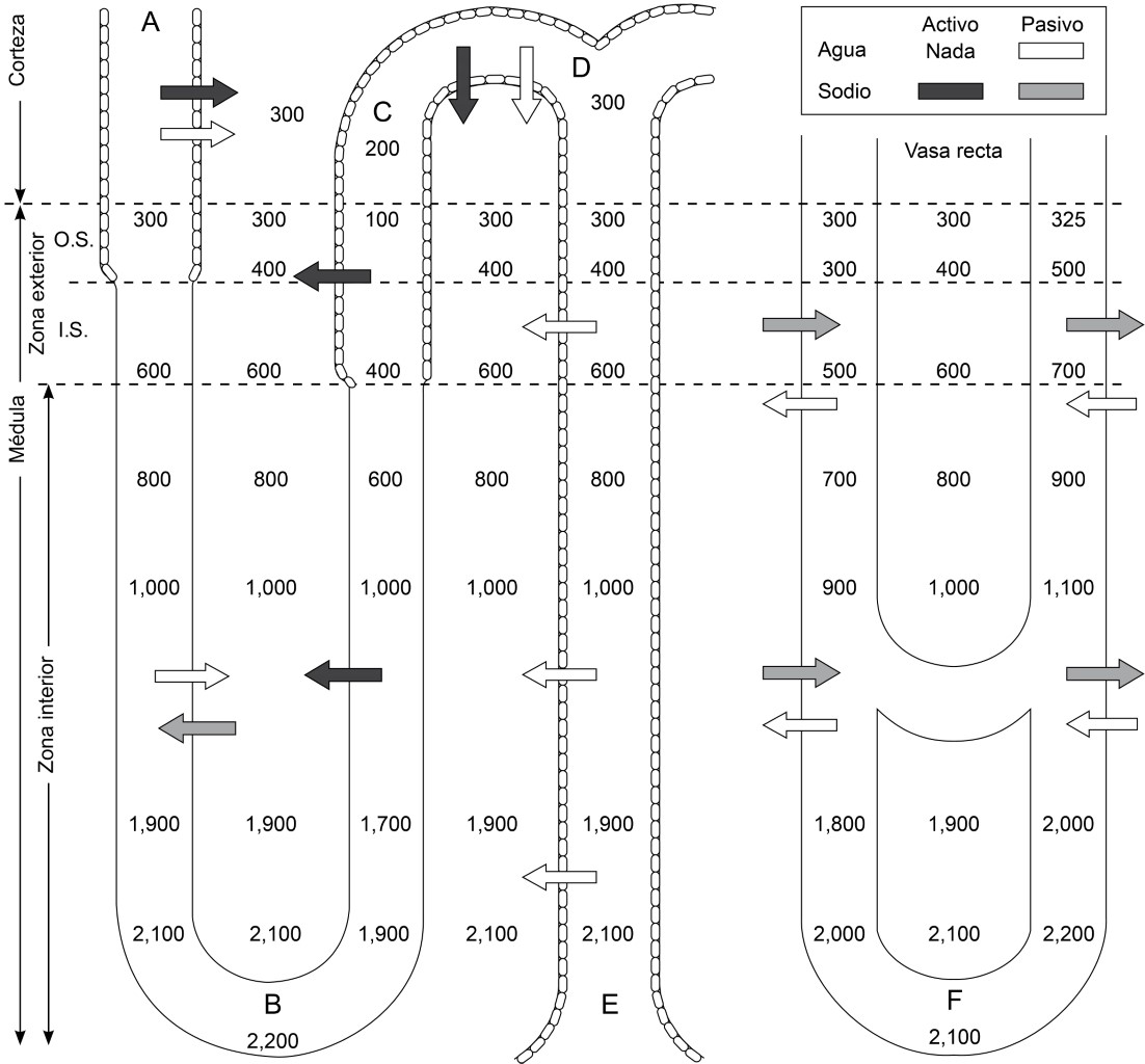 Esta hipótesis de la contracorriente fue atractiva para los investigadores de la época por tres hechos muy atractivos. El primero es que el líquido tubular se concentra a lo largo del asa de Henle, por la existencia de un gradiente osmótico progresivo de corteza a médula. Segundo, la hipótesis elimina el transporte activo de moléculas de agua y toda la operación es mediada por el transporte activo de sodio, proceso que en grado variable ocurre a lo largo de los distintos segmentos de la nefrona. El tercer hecho es que el mismo mecanismo de reabsorción de sodio permite no sólo concentrar la orina sino también diluirla. Para cumplir esta premisa tenemos que echar mano de la acción de hormona antidiurética (HAD). La HAD aumenta la permeablidad al agua del epitelio tubular en el tubo distal y el tubo colector. Desde esa época Sawyer30 y Wirz31 independientemente atribuyeron su acción a la presencia de "poros" en las células tubulares, que facilitaban la difusión del agua, tal como habían demostrado en 1952 Koefoed-Jolnsen y Hans Ussing32 en la piel de la rana.