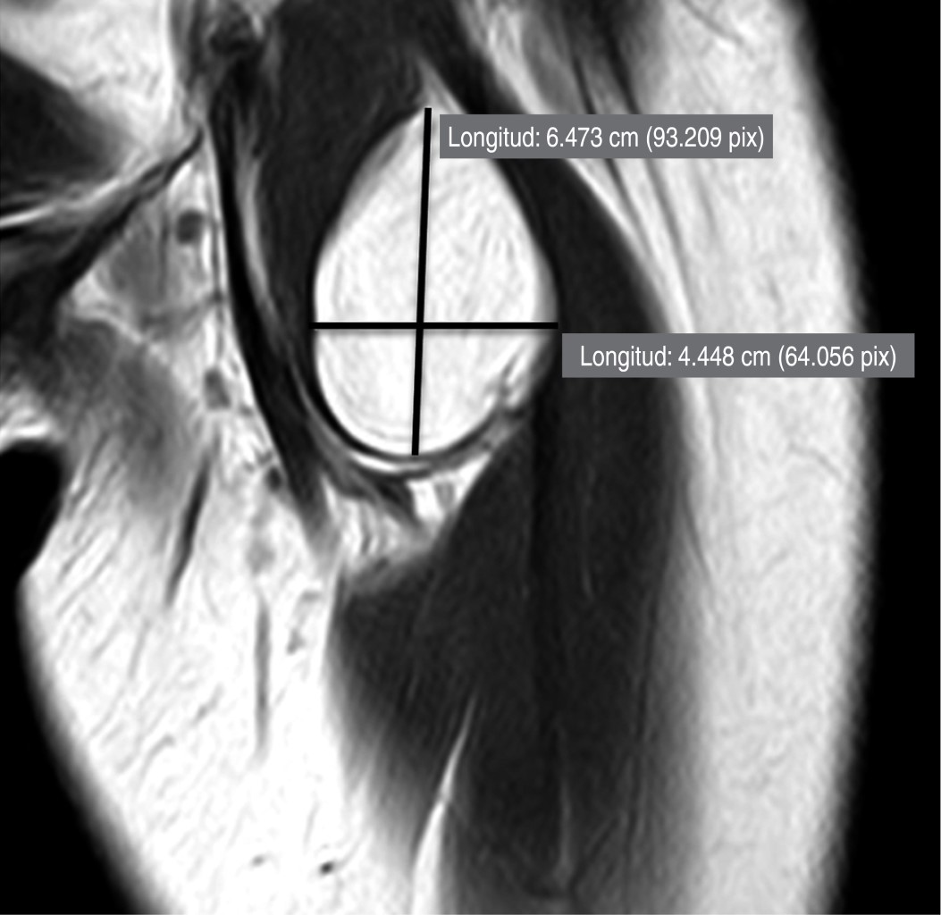 Se solicitó resonancia magnética nuclear (RMN) de muslo izquierdo, se encontró una masa lobular y tejido fibroso que atraviesan dichos lóbulos de aproximadamente 6.4 × 4.4 cm, con aumento de intensidad de la señal en T1 sin infiltración del tejido muscular circundante (Figura 1). Por los hallazgos clínicos y de imagen se decidió realizar resección quirúrgica de la lesión.