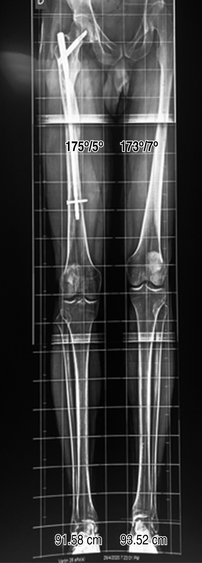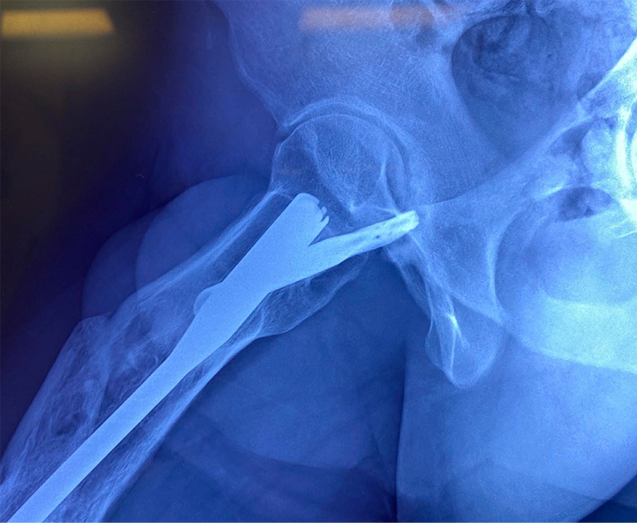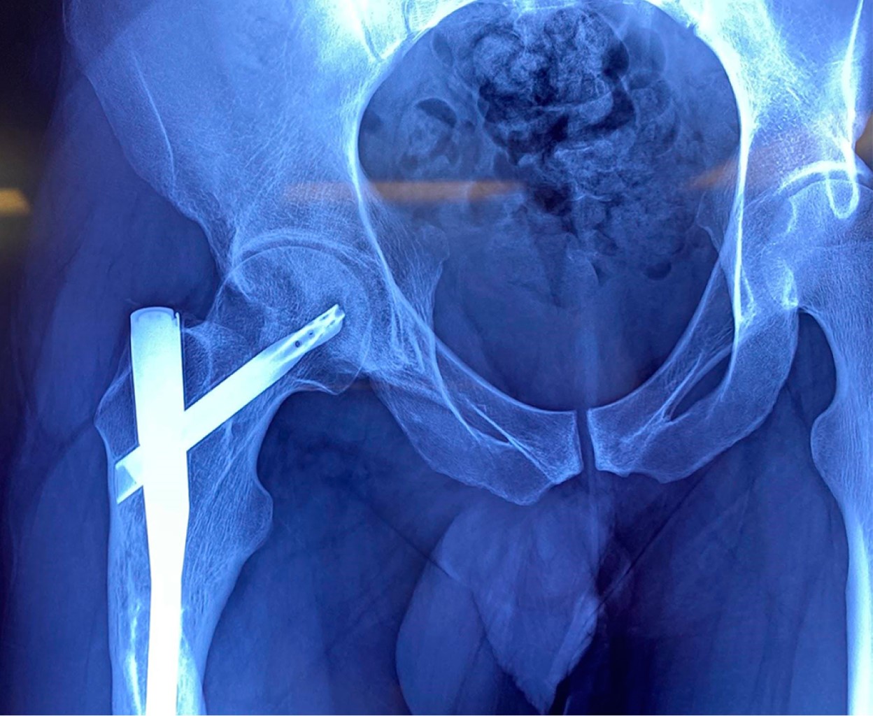 Se trata de un hombre de 28 años con antecedente de fractura diafisaria de fémur derecho tratada mediante enclavado centromedular en septiembre de 2018. Durante su periodo postoperatorio continúa con limitación en los arcos de movilidad de la cadera y la examinación radiográfica evidenció retraso en la consolidación, por lo que se decide dinamización del implante en julio de 2019 mediante retiro del tornillo distal.