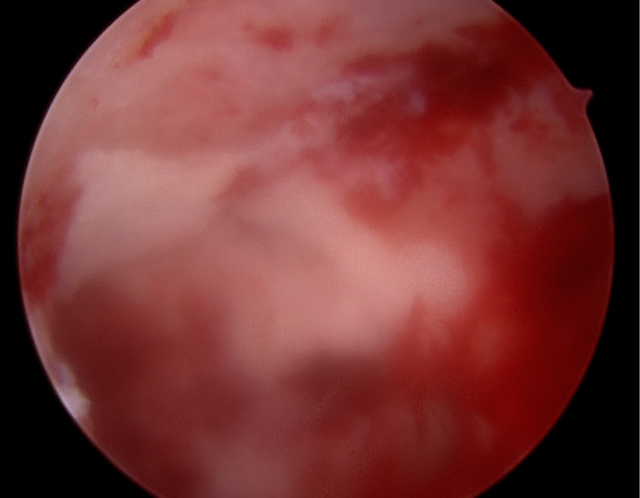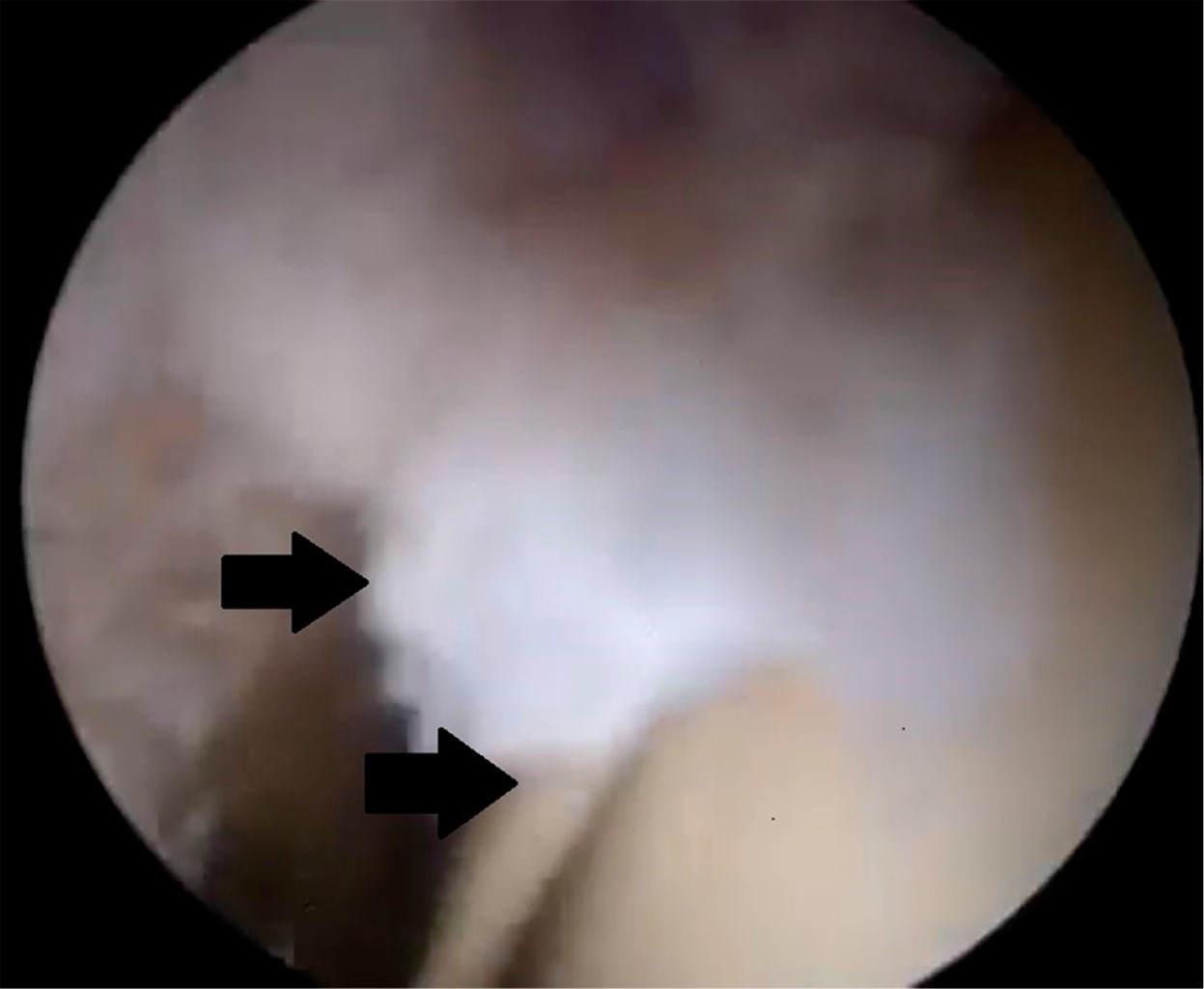 A la examinación artroscópica observamos cuerpos libres intraarticulares y daño condral en superficie en contacto con material de osteosíntesis (Figura 4). A través de túnel transóseo documentamos protrusión de material de osteosíntesis y contacto con superficie articular coxofemoral. La examinación dinámica mediante movilización de cadera derecha nos permitió observar zonas de lesión condral grado 4 de Outerbridge en la superficie de contacto de hélice en acetábulo posteromedial (Figura 5). Las superficies desprovistas de cartílago desbridaron con rasurador eléctrico hasta obtener bordes estables. Posterior al desbridamiento se documentó una zona lesional de menos de 1 cm2, por lo que nuestro tratamiento fue la regularización de los bordes y la estabilización del cartílago restante.
