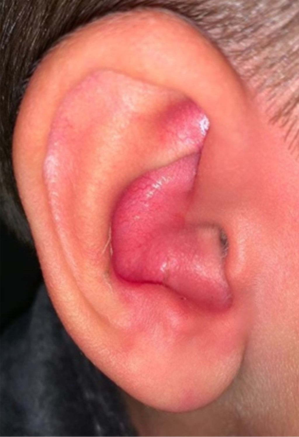 Egresa al séptimo día de estancia con cefadroxilo 30 mg/kg/día en dos dosis, completando una semana más (en total 15 días). En consulta de seguimiento a la semana de egresado se observa sólo eritema en mejillas y pabellón auricular derecho con discreto aumento de la temperatura, sin edema de pabellón auricular. Hay escama fina en antihélix derecho, en rodillas, escama gruesa en dedos e interdigital bilateral. Sin hallazgos en fosas nasales.