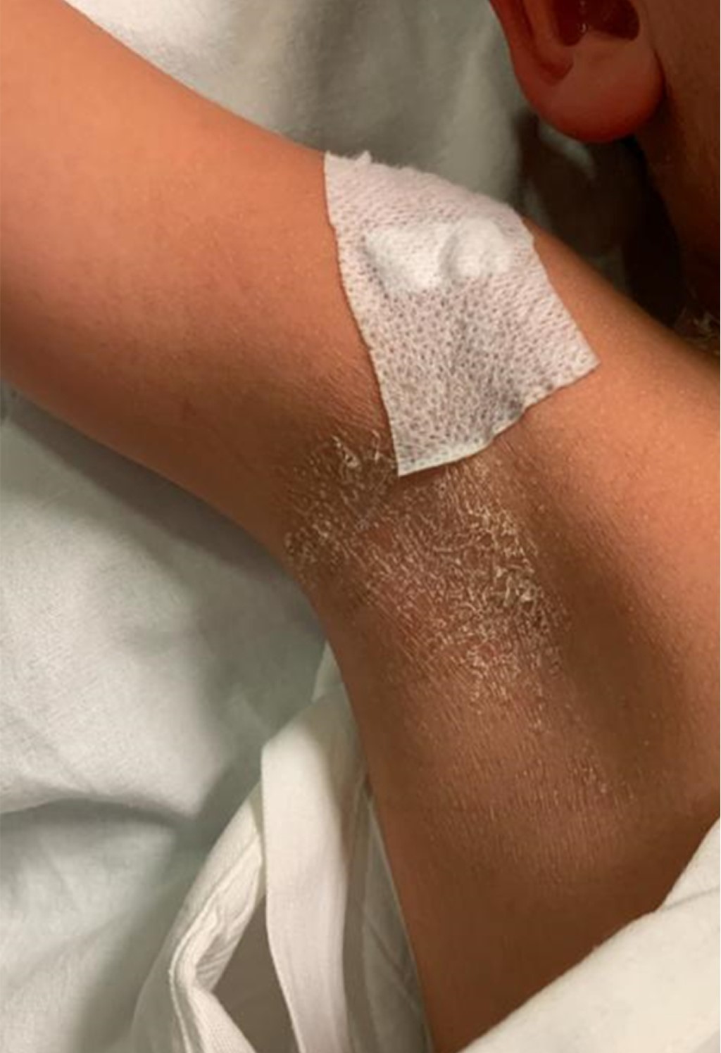 Inicia su padecimiento actual dos semanas previas a su ingreso, con presencia de lesiones en narinas, tórax anterior y tórax posterior diagnosticadas como impétigo buloso, tratadas con amoxicilina con clavulanato, ácido fusídico, crema emoliente y solución de Burow, con lo cual presenta mejoría de daños en tórax, aunque no en las perinasales. Después de una semana de completar medicación antibiótica con amoxicilina y clavulanato, notan aumento de temperatura en piel de cuello, axilas, abdomen y genitales, evolucionando al día siguiente con incremento del eritema, acompañado de prurito. Acudió a consulta un día previo a su ingreso, en donde se inició manejo con clindamicina vía oral y se aplicó hidrocortisona tópica, mejorando parcialmente la sintomatología cutánea. Al siguiente día acudió nuevamente a consulta y es referido con Dermatología Pediátrica, quienes sospechan síndrome de Stevens Johnson versus síndrome de piel escaldada estafilocócica por lo que es llevado al Servicio de Urgencias. Durante el padecimiento no hay historia de fiebre. Ingresó a hospitalización y se inició manejo por parte de dermatología con mupirocina periorificial dos veces al día, petrolato puro en zonas denudadas de piel y labios y también se realiza biopsia en brazo derecho por incisión con punch #4. Se solicita interconsulta con oftalmología quienes indican ciprofloxacino una gota cada 8 horas en ambos ojos y hialuronato de sodio una gota tres veces por día en ambos ojos. Se gestiona interconsulta con infectología pediátrica, donde se sospecha de S. aureus meticilino resistente (MRSA) por la pobre respuesta a la amoxicilina con clavulanato y por la falta de mejoría clínica a pesar de tener leucocitos y reactantes de fase aguda normales, por lo que se sugiere iniciar doble esquema con cefalotina y vancomicina esperando mejoría clínica de lesiones cutáneas.