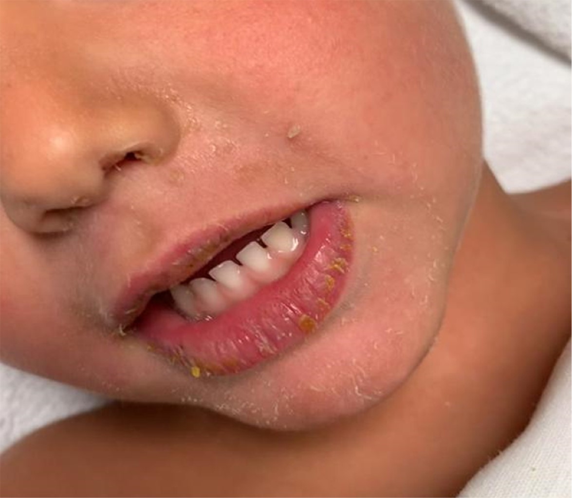 A su ingreso se observa dermatosis caracterizada por eritema con aumento de la temperatura local en cara, pabellones auriculares, cuello, espalda, tórax, brazos, antebrazos, genitales e ingles, de bordes mal definidos, con zona de escama fina en cara lateral derecha del cuello, así como placas eritematosas con costras meliséricas en narinas y surco subnasal (filtrum). Se observan labios xeróticos, fisurados y algunas costras hemáticas; máculas hipocrómicas en tórax anterior y posterior; palmas y plantas respetadas; hiperemia conjuntival leve, seca, con costra melisérica en canto del ojo izquierdo. Sin gingivitis, sin detrimentos en mucosa oral. Resto normal. (Figuras 1, 2, 3 y 4).