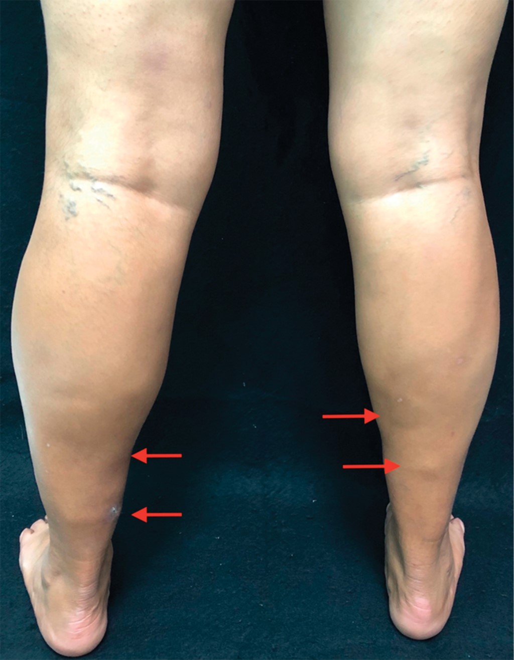 Paciente del sexo femenino, de 45 años de edad, quien acude al Centro Dermatológico Pascua por presentar dermatosis diseminada a extremidades inferiores, en las que afectaba cara posterior de piernas en su tercio medio e inferior, bilateral con tendencia a la simetría; constituida por cuatro nódulos eritematosos, dolorosos a la palpación. De evolución crónica (Figura 1).