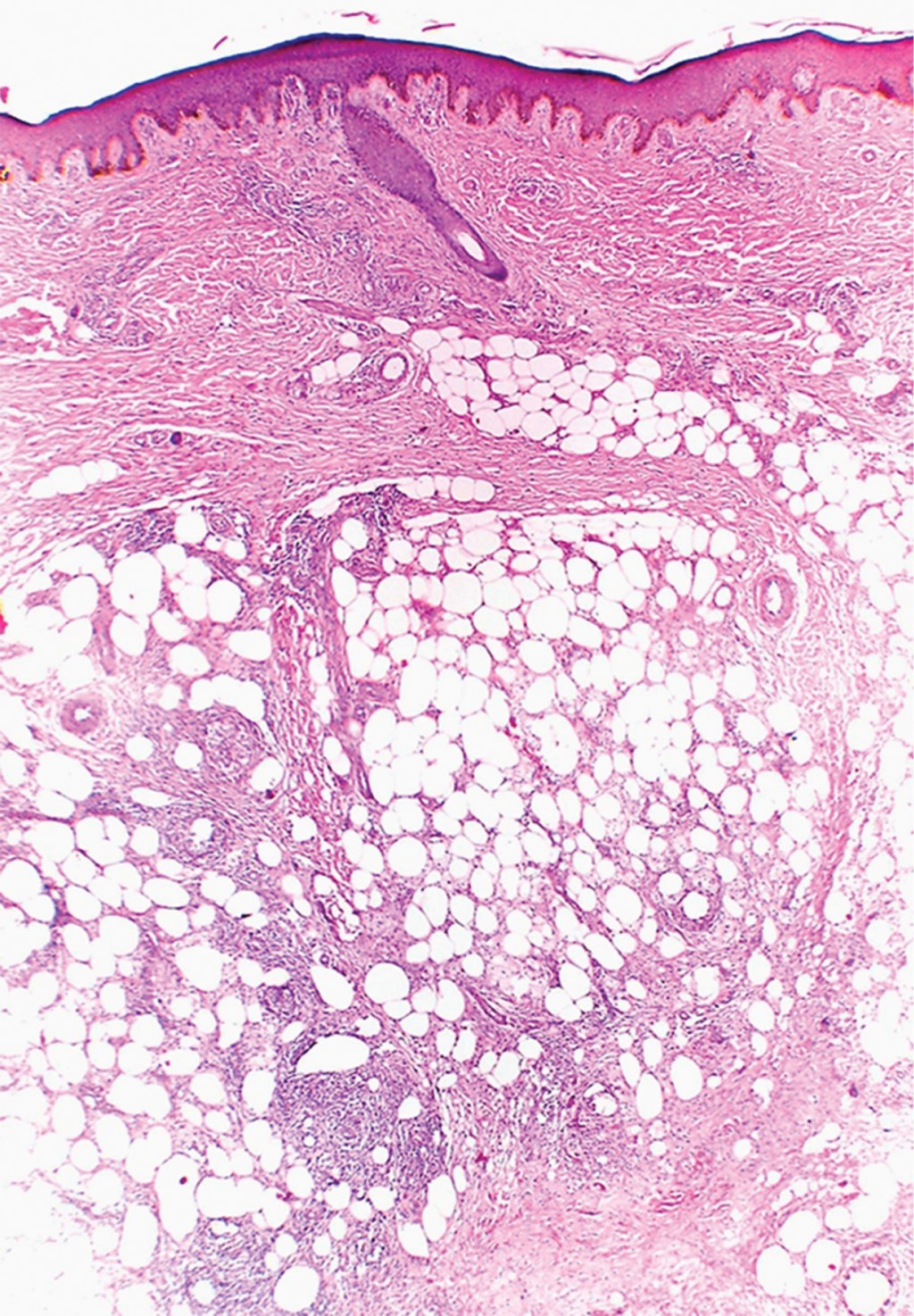 Se realizó nueva biopsia de uno de los nódulos. La imagen histopatológica mostró moderados infiltrados linfohistiocitarios perivasculares y perianexiales en dermis superficial y media. En dermis profunda y tejido celular subcutáneo, tanto en la porción septal como en la lobulillar, se apreciaban moderados infiltrados en focos constituidos por linfocitos, histiocitos, células epitelioides, esbozos de células gigantes multinucleadas, células gigantes tipo Langhans y de tipo cuerpo extraño. Dicho infiltrado invadía algunos vasos (Figura 2). Con lo anterior se realizó el diagnóstico histopatológico de paniculitis mixta granulomatosa con daño vascular.