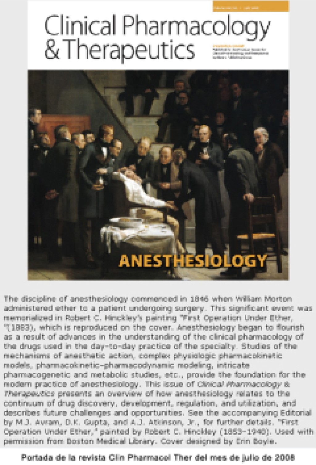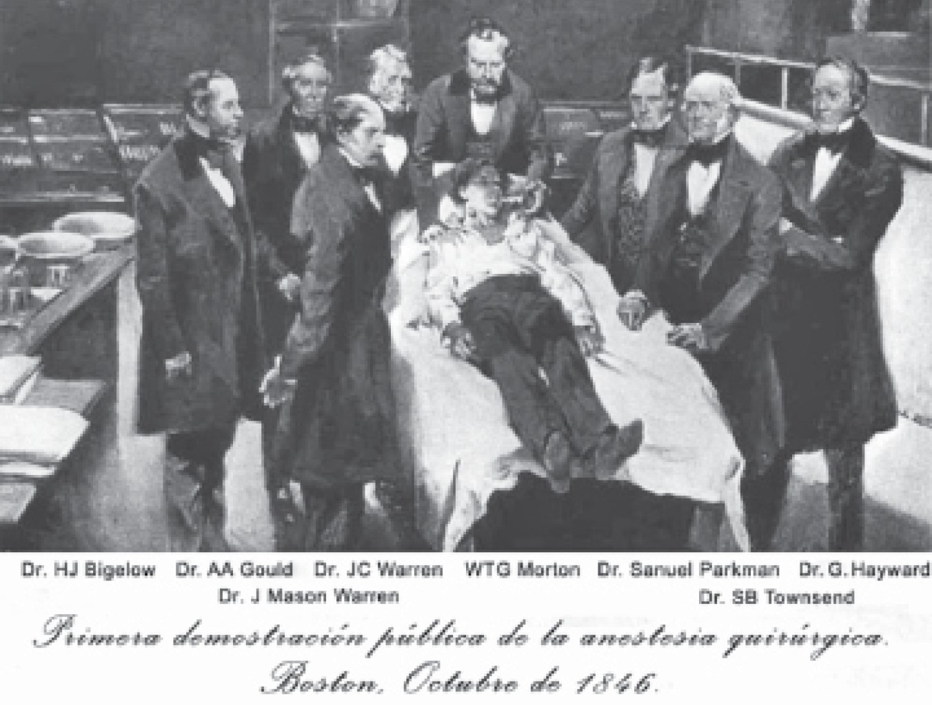 Se dirigió al jefe del Hospital General en Boston, con la petición de llevar a cabo una demostración pública de su método frente a médicos y estudiantes de medicina. Recibió por escrito una invitación para el 16 de octubre de 1846. Gilbert Abbott, un paciente de 20 años, respiró los vapores desde una esfera de vidrio que contenía en su interior una esponja embebida en éter. Tras un estado inicial de excitación, el paciente se durmió. "Warren en cinco minutos extirpó un tumor superficial congénito bajo el maxilar inferior en el lado izquierdo del cuello del paciente". A este evento se le considera el momento del nacimiento de la anestesiología moderna (Figura 4).