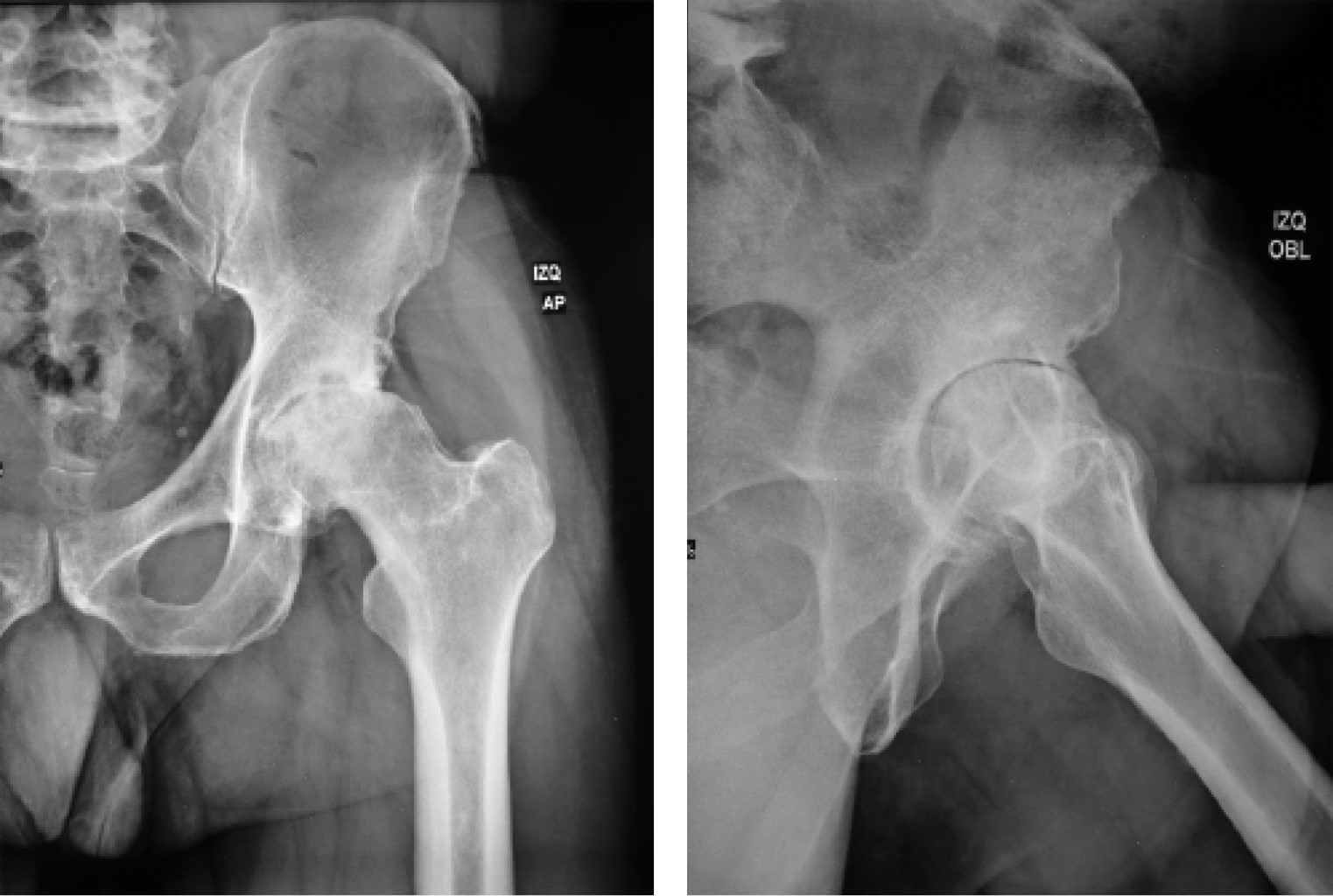 Previa aprobación por los Comités de Investigación y de Ética en Investigación de este hospital (Centro Médico ABC), se efectuó un estudio retrospectivo de todos aquellos casos consecutivos de artroplastía total de cadera, entre Abril de 2018 y Abril de 2020, realizados por abordaje anterior por el mismo cirujano, en el misma institución hospitalaria, igualmente utilizando sistema de reemplazo de cadera con vástago femoral AMIS-H y copa acetabular Versafit-CC (Medacta, Castel San Pietro, Suiza) con liner de polietileno de altos enlaces cruzados y cabeza de cerámica o metal. Se incluyeron 50 caderas en 47 pacientes. Para la totalidad de ellos se formalizó una planificación preoperatoria aprovechando radiografías en proyección anteroposterior con apoyo a una distancia estricta de un metro (Figura 1), proyección anteroposterior de la cadera afectada y proyección oblicua axial a idéntica distancia, así como eje mecánico en la generalidad de los hechos, a excepción de aquellos con fractura de la articulación, a quienes no se les realizó proyección oblicua (Figura 2). Se hizo la medición y selección del tamaño de implantes a utilizar con los sistemas de plantillas específicos de la marca referida. Todos estos afectados tuvieron un seguimiento clínico y radiográfico por 90 días postoperatorios.