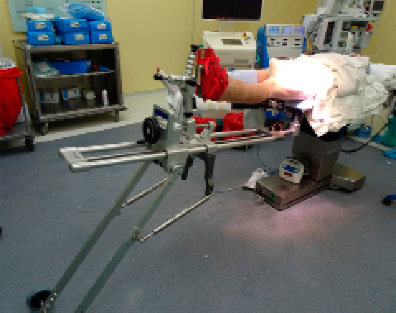 La estrategia quirúrgica se ejecutó poniendo al paciente en posición supina y colocando la extremidad pélvica en el posicionador especial (Figura 3), el cual es para tracción, movilización y posicionamiento de ésta, controlando la rotación, extensión y aducción necesarias para realizar la cirugía y colocar los componentes; se utilizó intensificador de imágenes.