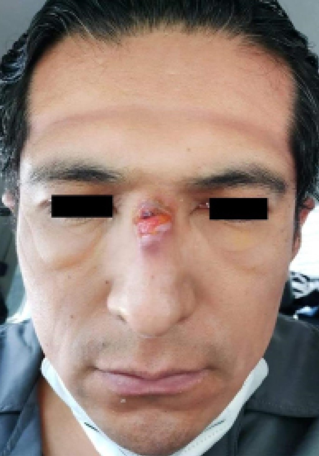 Para la salvaguarda facial se usan diferentes tipos de máscaras, cubrebocas y lentes de protección que deben estar muy bien ajustados a la piel. Estos comprimen, aumentan la presión y disminuyen la irrigación sanguínea, causando hipoxia, isquemia y edema en partes blandas de la cara. La pérdida transepidérmica de agua por maceración y acúmulo de humedad en la superficie, reduce la capacidad del estrato córneo a resistir la presión y las fuerzas mecánicas, lo que conlleva indentaciones, eritema, ampollas, desepitelización y úlceras dolorosas que se podrían sobreinfectar (Figura 3). Las máscaras N95 suelen contener poliuretanos alergénicos. Las zonas más afectadas por los cubrebocas y por los lentes de seguridad son el puente del dorso nasal hasta 83.1%, el arco zigomático y el área de la frente. Otros elementos de riesgo presentes y a considerar importantes son el antecedente de dermatitis atópica y el invierno.12