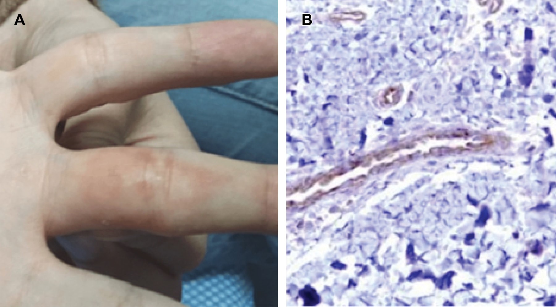 Femenino de 35 años de edad que inicia con vesículas en las caras laterales de la segunda y tercera falange de la mano izquierda, ahora con eccema seco y fisurario del dedo anular. Se obtiene biopsia, donde se observa infiltrado perivascular de los vasos en dermis superior y media. La inmunohistoquímica con antiproteínas de SARS-CoV-2 positiva alrededor de los vasos sanguíneos, espongiosis intensa (Figura 1).