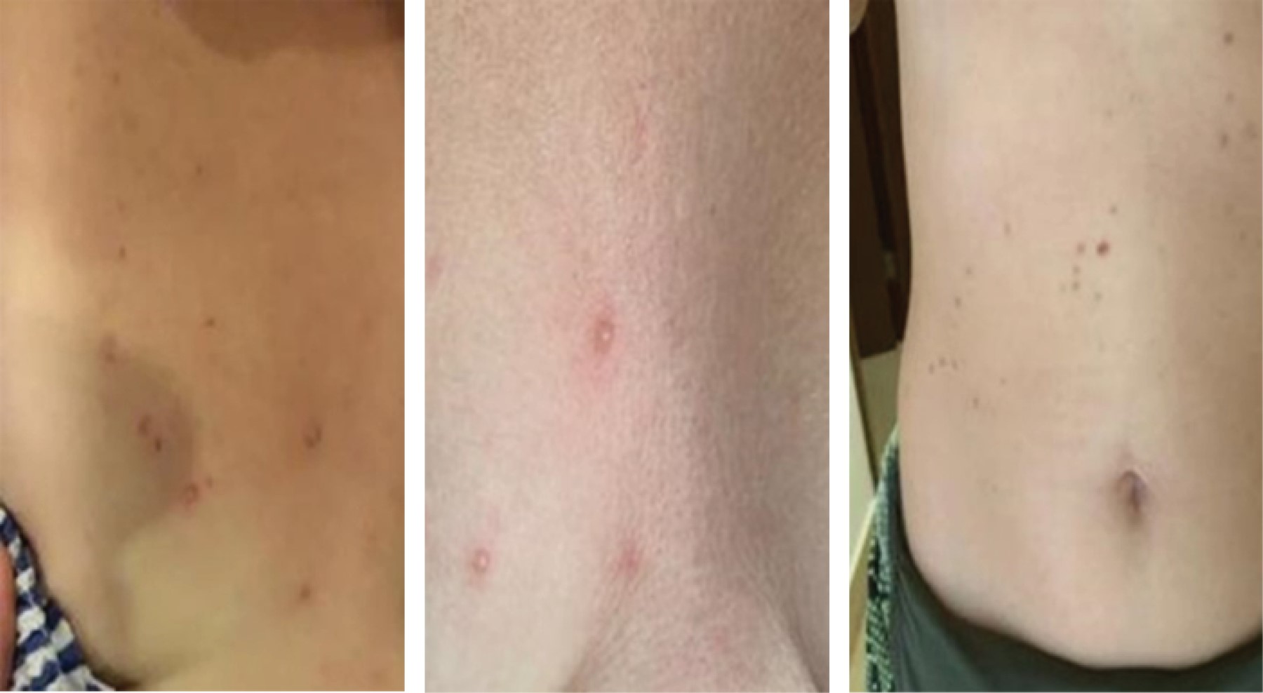 Paciente femenino de 61 años de edad, enfermera, sin antecedentes de importancia que acude a consulta por presentar una erupción diseminada a tórax posterior, cuello, axilas y dorso, caracterizada por múltiples vesículas milimétricas hialinas acentuadas sobre una base de piel eritematosa, la cual era pruriginosa (Figura 3).