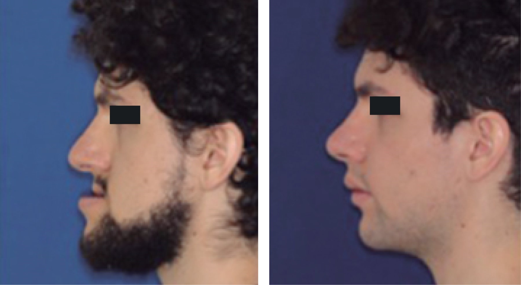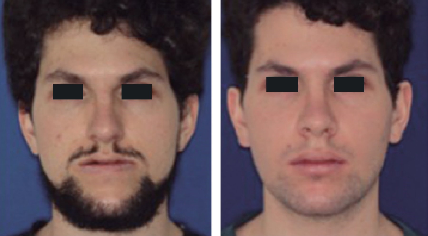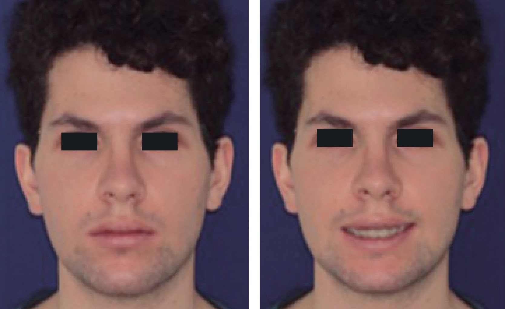 Hombre de 23 años de edad, sin antecedentes patológicos de importancia, que ulterior a la exploración física en cara se evidencia implantación de cabello adecuada, con proyección malar disminuida y labios delgados, facies con ligera asimetría facial, perfil cóncavo, forma de cráneo normocéfalo y forma de cara mesoprosopa, mentón protruido, ángulo frontonasal 130o, ángulo nasolabial 127o y ángulo mentolabial 88o (Figuras 1 y 2).