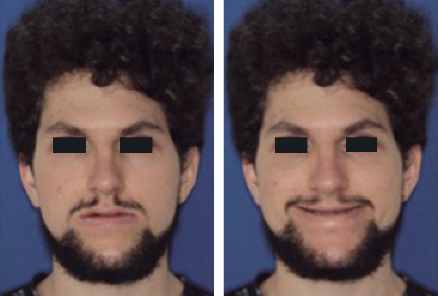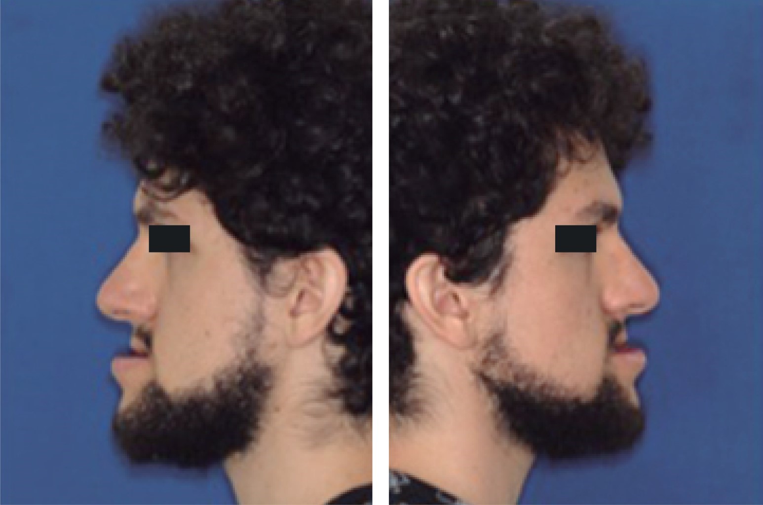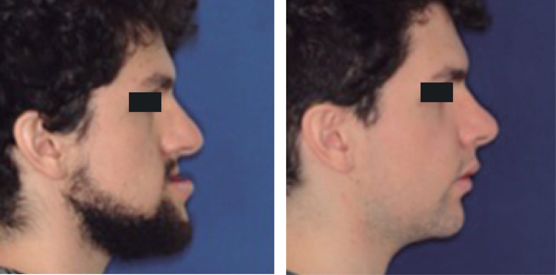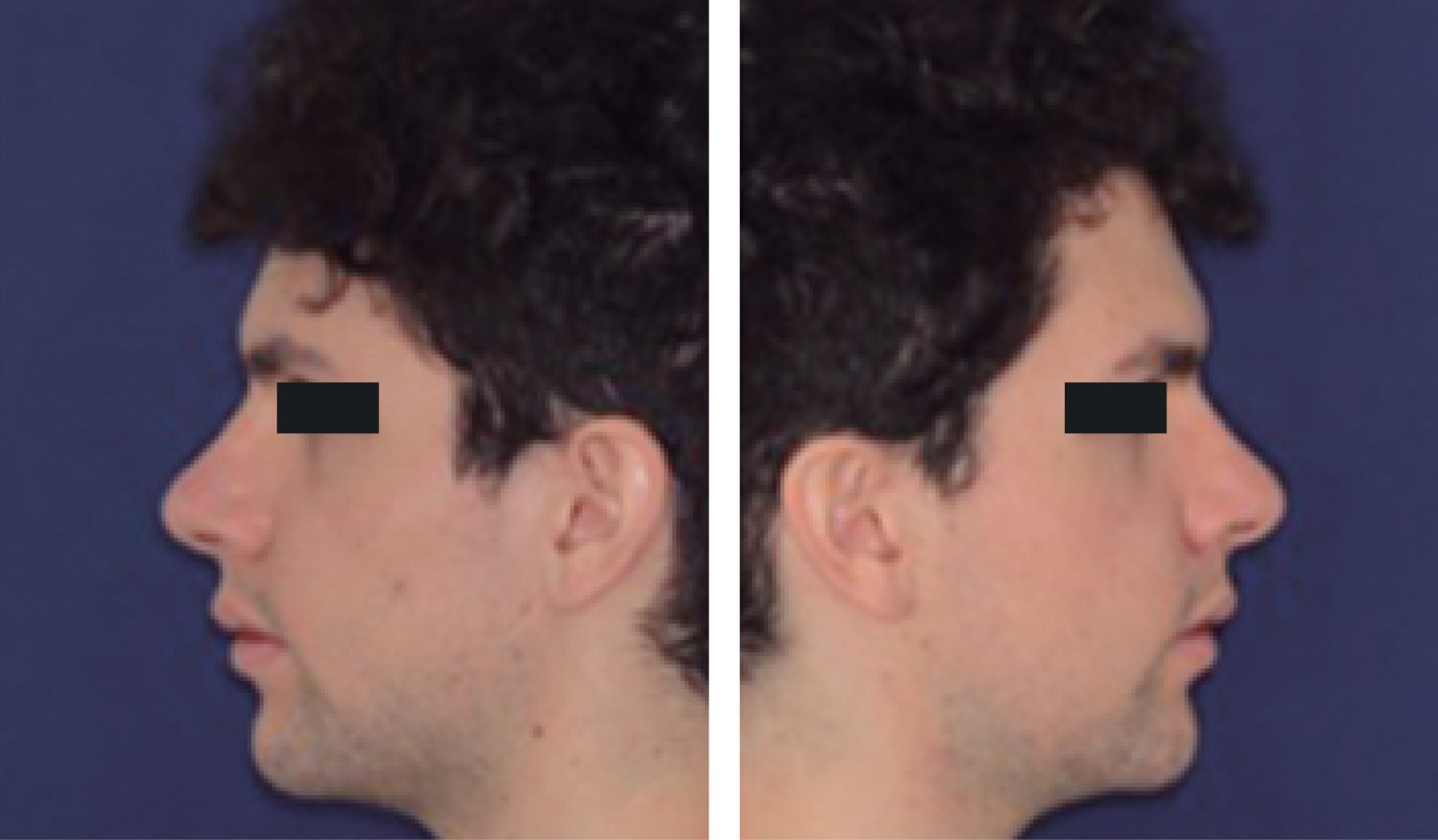 Hombre de 23 años de edad, sin antecedentes patológicos de importancia, que ulterior a la exploración física en cara se evidencia implantación de cabello adecuada, con proyección malar disminuida y labios delgados, facies con ligera asimetría facial, perfil cóncavo, forma de cráneo normocéfalo y forma de cara mesoprosopa, mentón protruido, ángulo frontonasal 130o, ángulo nasolabial 127o y ángulo mentolabial 88o (Figuras 1 y 2).