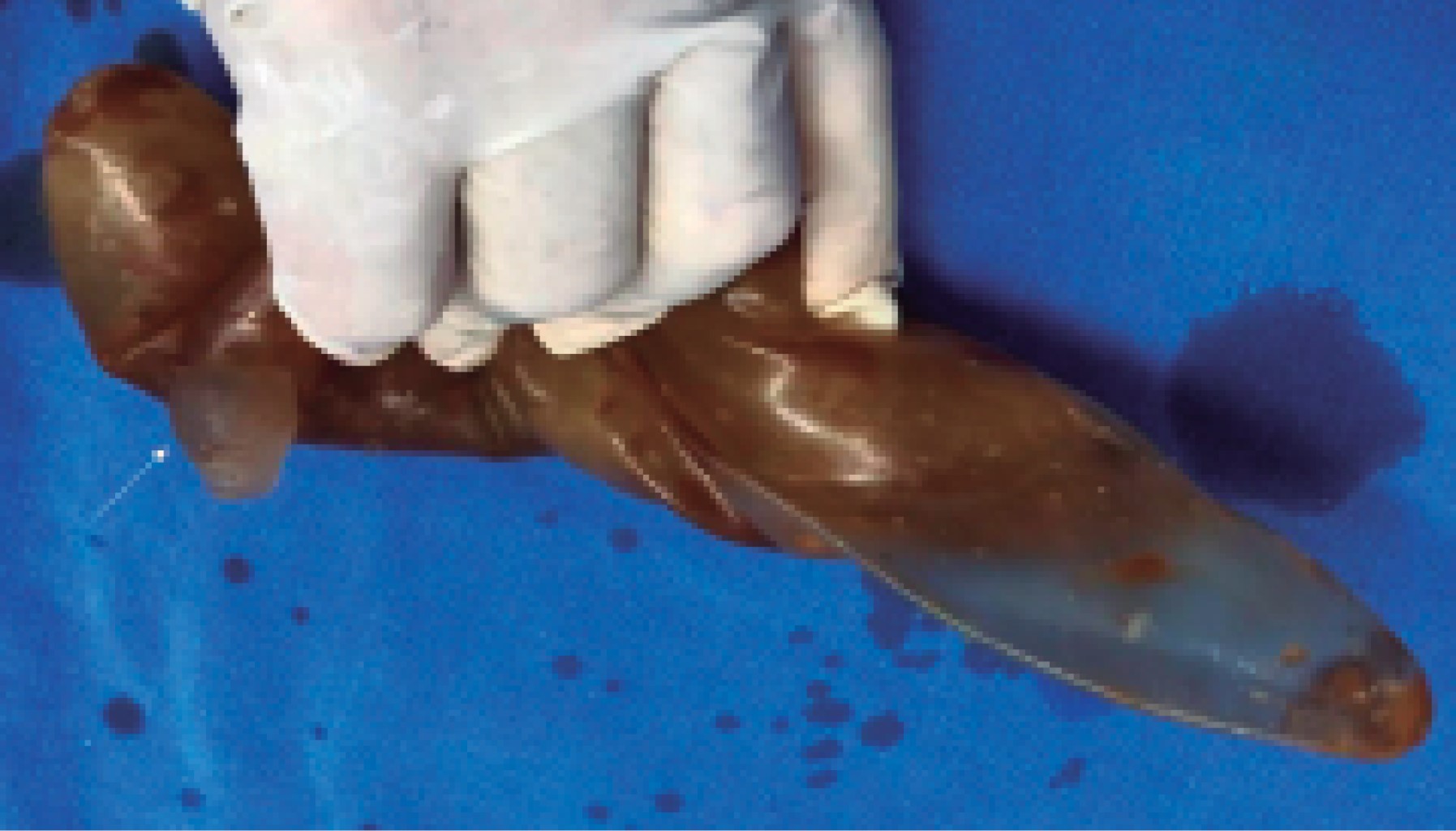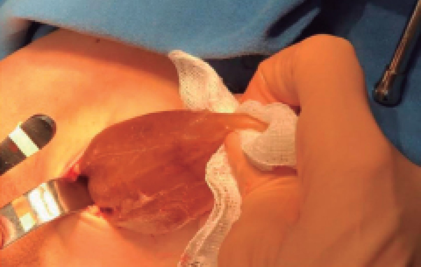 Se realizó una incisión de 6 cm por debajo del hueco poplíteo, se disecaron los tejidos hasta identificar la cápsula del implante; al incidirla drenó aproximadamente 350 mL de líquido oscuro (achocolatado), inodoro. Se procedió a la extracción del implante, se encontró con varias perforaciones por donde se fugaba el gel de silicón y se resecó la cápsula (Figuras 7, 8 y 9). En seguida se efectuó un aseo del bolsillo con solución fisiológica y agua oxigenada, se colocó un drenaje de silicón y se suturaron las heridas en dos planos: el tejido celular subcutáneo con vicryl 4-0 y la piel con nylon 4-0, para finalmente cubrirse con gasa y vendaje. El líquido y la cápsula fueron enviados a patología y laboratorio para su cultivo. Se manejó como paciente externa y se le prescribió ketorolaco, cefalosporina y etamsilato. Al cuarto día se le retiró el drenaje por haber drenado sólo 5 mL en 24 horas y color serohemático. Al décimo día se retiraron los puntos y se indicaron medias elásticas y deambulación.