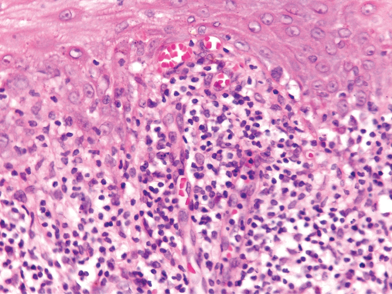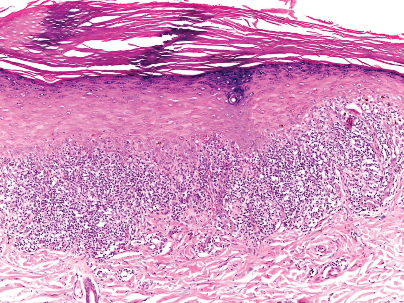 Se realizó biopsia incisional en una de las placas, la cual reportó epidermis con hiperqueratosis ortoqueratósica, tapones córneos, hipergranulosis focal, zonas con acantosis irregular moderada que alternan con áreas de atrofia y degeneración hidrópica de la capa basal con formación de cuerpos coloides; en dermis superficial vasos dilatados e infiltrado moderadamente denso dispuesto en banda constituido por linfocitos, histiocitos y algunos melanófagos (Figuras 2 y 3).