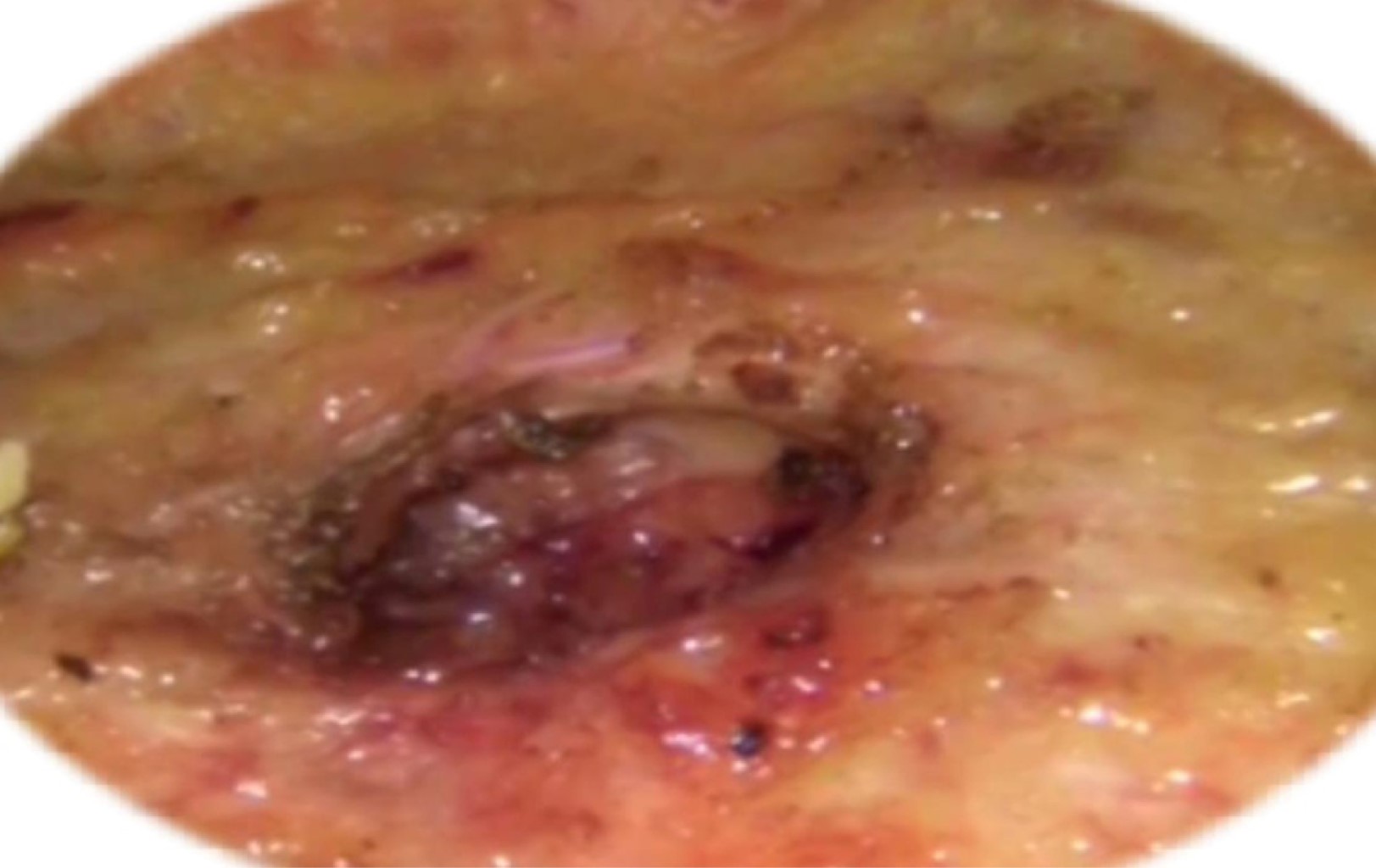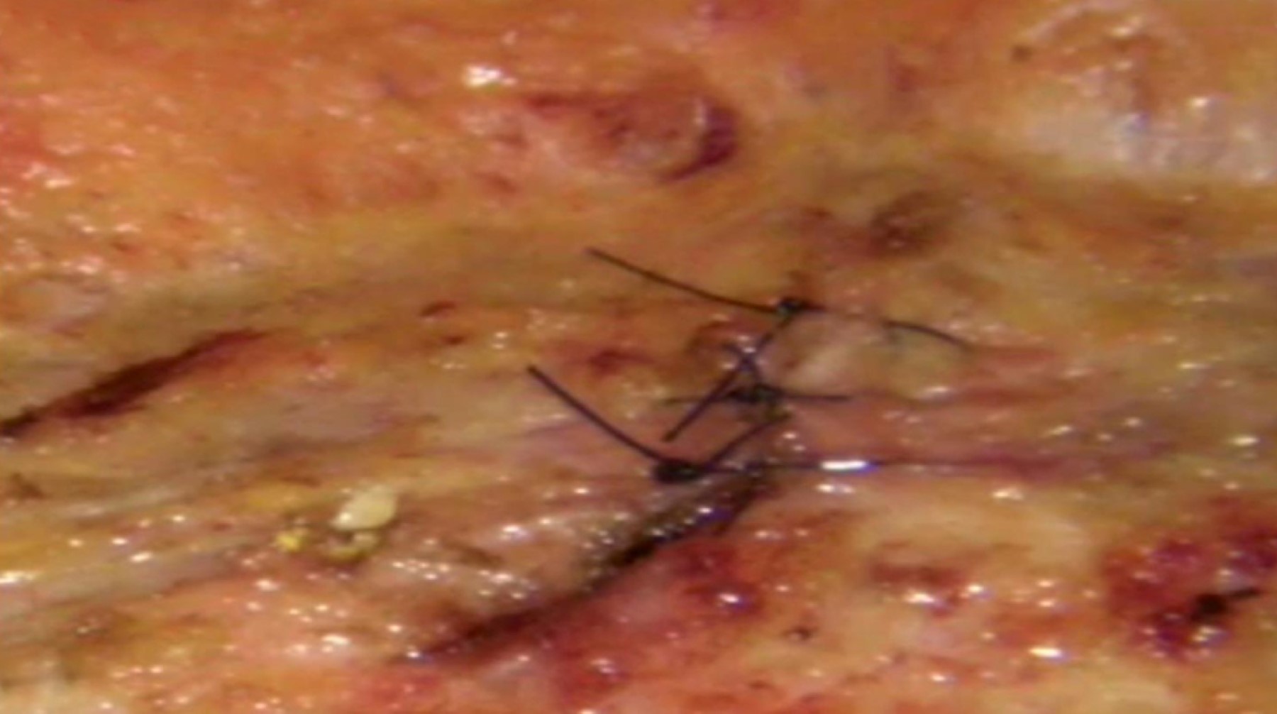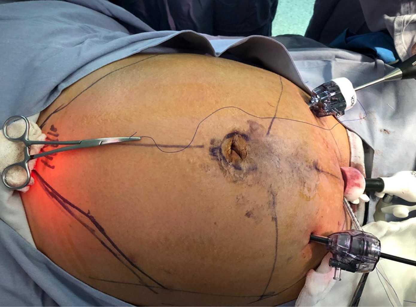 Se decide realizar un abordaje laparoscópico únicamente subcutáneo y colocación de material protésico de polipropileno, aceptando y firmando consentimiento informado. Se realizó tratamiento quirúrgico mínimamente invasivo asistido por laparoscopía, colocando trocares de trabajo de 10 mm suprapúbico y 2 de 5 mm en línea medioclavicular en cuadrante inferior derecho e izquierdo (Figura 1), encontrando defecto supraaponeurótico epigástrico de 2 cm y defecto umbilical de 3 cm (Figura 2). Se realizó cierre primario con puntos Smead Jones con sutura Monocryl® 2-0 (Figura 3) y se realizó plastia con técnica supraaponeurótica laparoscópica sólo subcutánea (SCOLA), con colocación de material protésico de polipropileno monofilamento (Figura 4). Se colocó Biovac® supraaponeurótico. Sin complicaciones transoperatorias, tiempo quirúrgico 60 min. Se egresó 48 horas después del evento quirúrgico, con adecuada evolución posquirúrgica, sin sangrado activo en los puertos laparoscópicos, no se palpan defectos aponeuróticos ni defectos herniarios a los seis meses del posoperatorio.