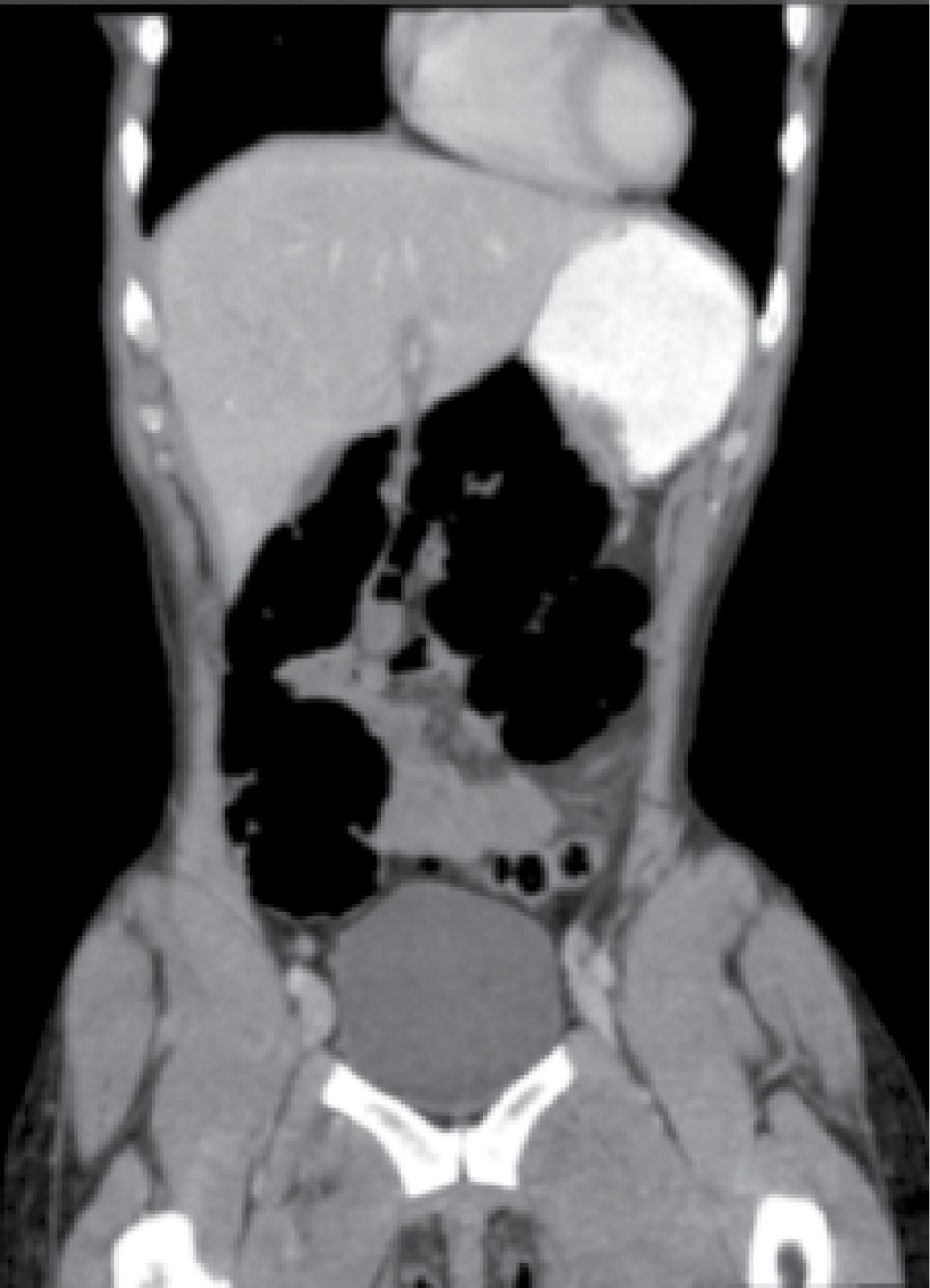 Al servicio de urgencias acudió paciente de sexo femenino, de 45 años de edad, con cuadro de dolor abdominal opresivo severo (10/10), en mesogastrio, sin irradiaciones, de tres horas de evolución. Al interrogatorio negó fiebre, náusea, vómito, disuria, atenuantes, exacerbantes, última evacuación horas antes de su ingreso de características normales. Únicamente con antecedente de enfermedad ácido péptica con manejo sintomático esporádico con esomeprazol y magaldrato dimeticona. A la exploración física reveló taquicardia e hipertensión durante episodios de dolor, abdomen blando, depresible, escasa distensión del mismo, peristalsis hipoactiva, malestar y queja a la palpación profunda en marco cólico, sin datos de irritación peritoneal, resto sin anormalidades.
