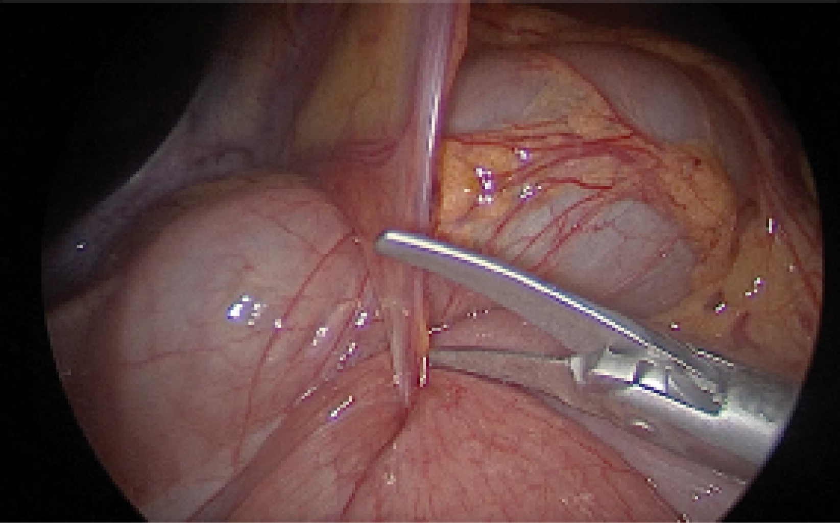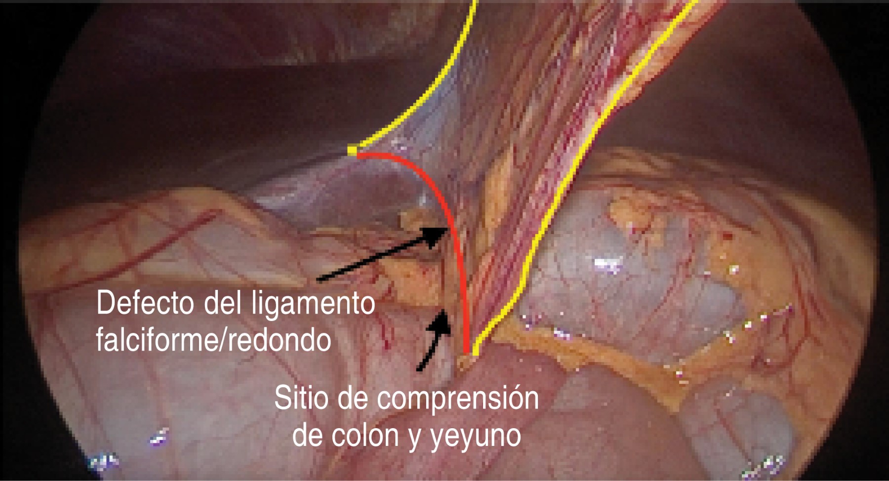 Se indicó el manejo quirúrgico con base en laparoscopía diagnóstica. Se colocaron puertos sin incidentes, no se observó líquido libre ni distensión de asas. Se identificó colon transverso e intestino delgado (yeyuno) atravesando un orificio en la unión de los ligamentos falciforme y el redondo del hígado (Figuras 2 y 3). Ese segmento intestinal no presentaba alteraciones de perfusión, el yeyuno mostraba leve aumento en la vascularidad. Ninguna de las dos estructuras se encontraban fijas al ligamento. Se aplicó corte frío en el borde posterior del cordón y se liberaron ambas asas intestinales, las cuales presentaron peristalsis espontánea. Se efectuó la revisión del resto de la cavidad sin encontrar otras claves y se realizó el cierre de puertos de forma usual. Se reportó un sangrado posoperatorio de 5 mL y un tiempo quirúrgico de una hora con 30 minutos.