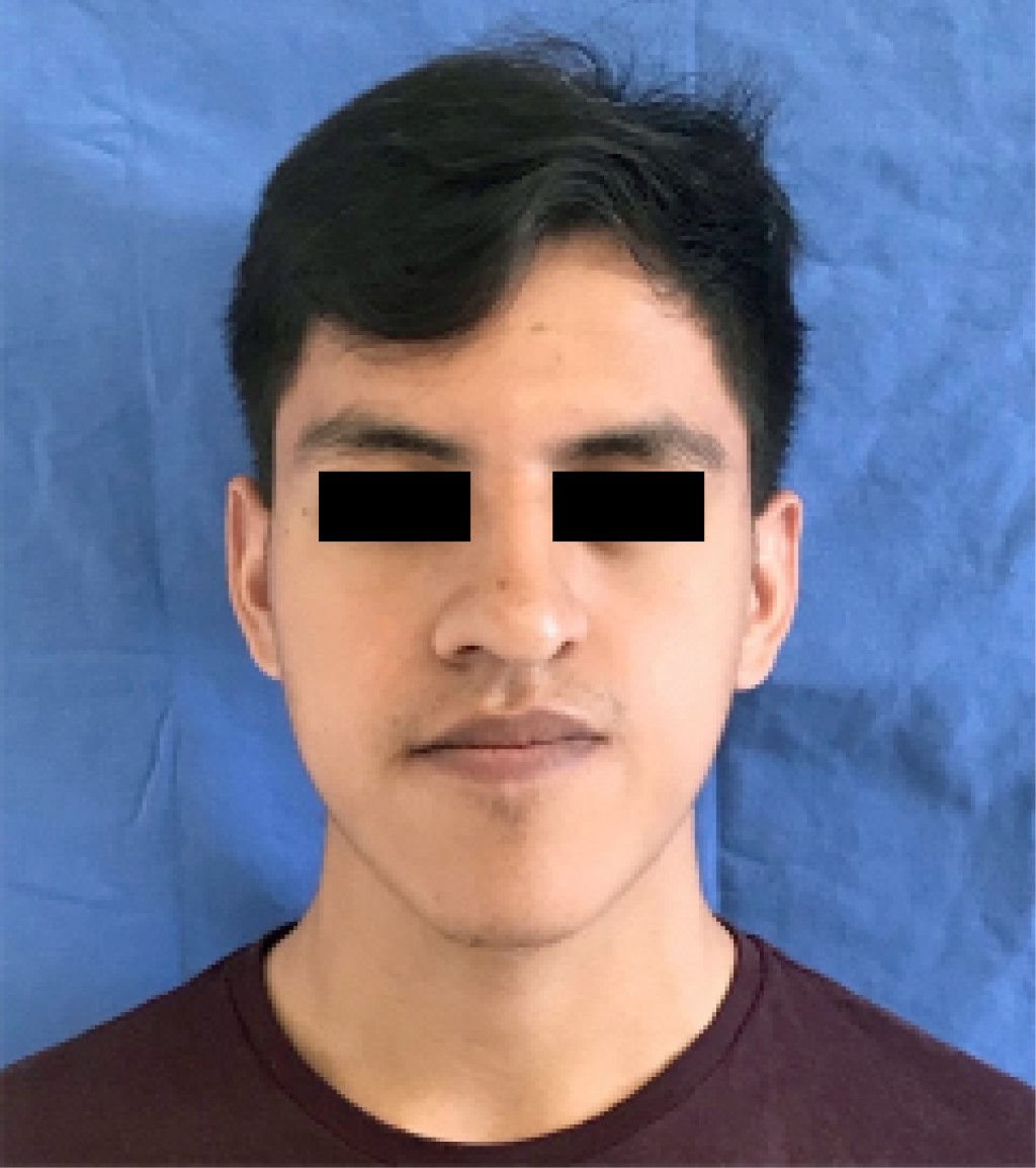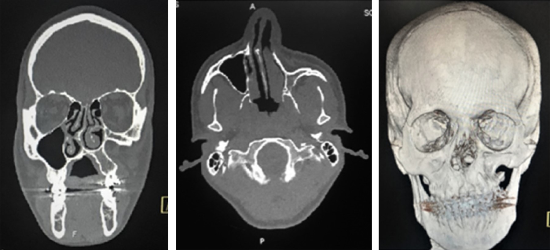 Se trata de un hombre de 18, el cual es remitido al Servicio de Cirugía Maxilofacial del Instituto Nacional de Enfermedades Respiratorias por Departamento de Ortodoncia de Clínica Dental Universitaria para valoración por asimetría facial. Se encuentra en su cuarto año de tratamiento ortodóntico con el objetivo de realizar ortodoncia camuflaje. No refiere antecedentes médicos de relevancia, incluidos antecedentes quirúrgicos o traumáticos. A la exploración física observamos paciente neurológicamente íntegro, cráneo normocefálico, adecuada inserción del cabello, presenta distopia a expensas de enoftalmos ojo izquierdo, hipoplasia fosa nasal y pabellón auricular izquierdo, depresión en región infraorbitaria ipsilateral (Figura 1) perfil cóncavo clase III, canteamiento maxilar, sin alteraciones en región de ATM con adecuados movimientos mandibulares, intraoralmente con mal oclusión clase III de Angle, sobremordida negativa y mala posición dental. Se solicita tomografía computarizada con cortes finos y ventana para hueso, observando en los cortes coronales un aumento en el volumen de la órbita izquierda, así como ausencia completa del seno maxilar izquierdo, desviación del septum nasal e hiperplasia de cornete inferior izquierdo, en los cortes axiales se corrobora aplasia de seno maxilar izquierdo y en reconstrucción 3d se observa en la vista anterior una depresión de la pared anterior del hueso maxilar (Figura 2). El plan de tratamiento propuesto es la toma y aplicación de injerto autólogo de cresta iliaca anterior para corregir la pérdida de volumen en la región anterior del maxilar y cirugía ortognática para corregir la discrepancia dentoesqueletal.