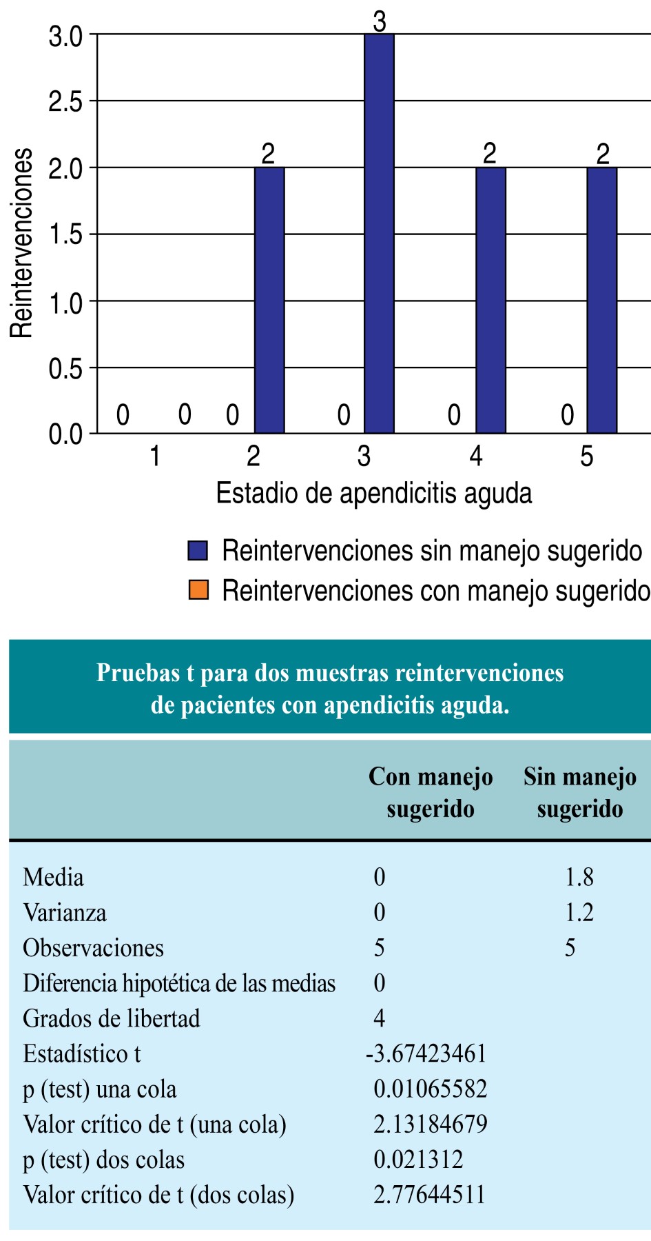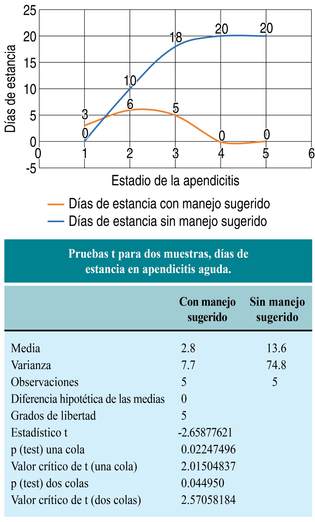 Se realizó estadística descriptiva de los datos demográficos, estadística analítica para comparar los grupos de apendicitis utilizando la t de Student en variables continuas para valorar la clasificación sugerida, con un intervalo de confianza de 95%, utilizando el sistema de análisis de datos de Excel. La probabilidad de < 0.05 fue aceptada como estadísticamente significativa.