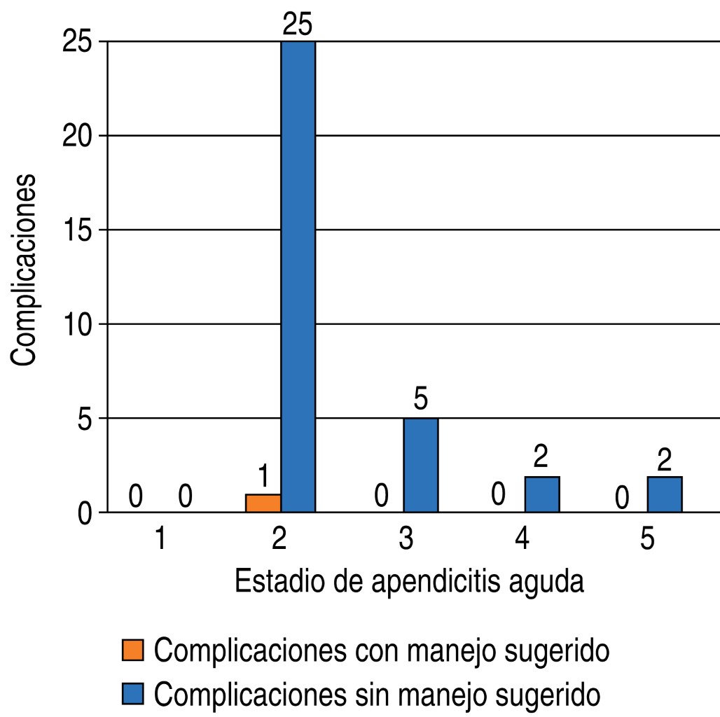 En estadio 3, los cinco casos sin manejo sugerido presentaron complicación de infección de sitio quirúrgico superficial y profundo, en tres casos se requirió reintervención por absceso residual y respuesta inflamatoria sistémica, con más días de estancia hospitalaria llegando a 12-18 días con mayor gasto hospitalario en general.