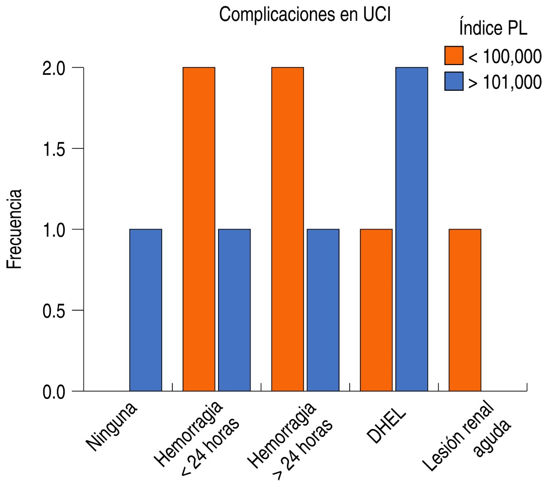 Las complicaciones encontradas en los sujetos con IP/L < 10 × 104/μ/L, fueron las siguientes: hemorragia intraoperatoria, tres (27.3%) y durante su estancia en UCI, cuatro (36.4%), desequilibrio hidroelectrolítico, uno (9.1%), lesión renal aguda, una (9.1%), defunciones, dos (18.2%).