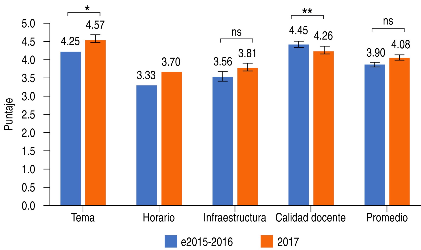 Tras analizar los resultados de la Figura 1, éstos sugieren que tanto e2015-2016 como e2017 han sido bien aceptados por los grupos de entrenamiento (> 78% de satisfacción general).20 Asimismo, los temas abordados y la calidad docente destacan como los aspectos mejor evaluados (> 85% satisfacción), lo que a nivel de programa indicaría realizar pequeñas modificaciones al contenido y didáctica del programa, así como establecer programas de capacitación/entrenamiento para los docentes de PCS. Sin embargo, el horario y la infraestructura fueron los aspectos peor evaluados (< 76% satisfacción). En línea con lo anterior, los comentarios de los estudiantes, emitidos en el segmento de pregunta abierta de la encuesta de satisfacción, guardan estrecha relación con el horario de ejecución de PCS (14:00-19:00) y la necesidad de contar con mayor infraestructura (equipos, reactivos e insumos). Es importante considerar estos aspectos, puesto que representan importantes puntos de mejora en el desarrollo y aplicación del programa.