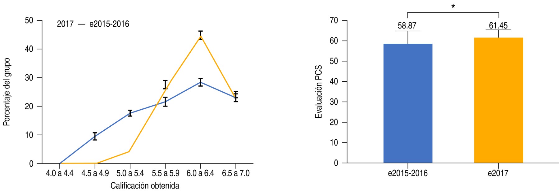 Análisis nivel II Kirkpatrick: el nivel de aprendizaje se evaluó utilizando tres instrumentos, una prueba práctica (60%), una prueba escrita (20%) y una exposición (20%). Las rúbricas para las pruebas prácticas contemplaron variables procedimentales; mientras que las pruebas escritas se enfocaron en los fundamentos de cada procedimiento y la obtención de resultados. La exposición se realizó en modalidad Pecha-Kucha 20 × 20,34 y cada participante abordó una enfermedad relacionada al módulo, enfatizando los procedimientos para la confirmación diagnóstica. Los instrumentos utilizados abordaron una escala 1 a 7, estableciendo como criterio de aprobación nota 4. Los resultados de las evaluaciones fueron segmentados en grupos de cinco décimas, con base en la distribución de los promedios ponderados de PCS, utilizando la nota final de cada estudiante (e2015-2016 o e2017).