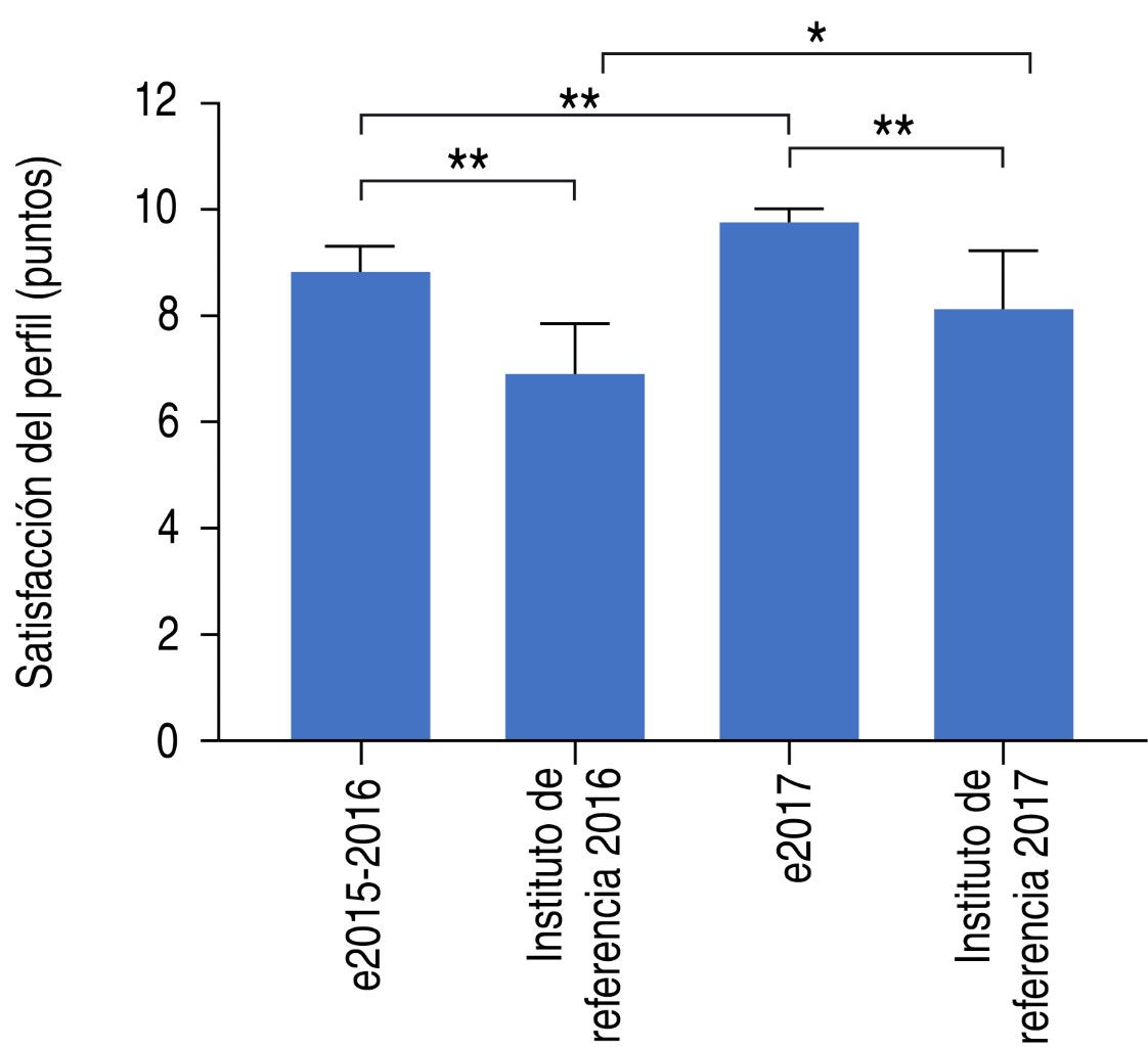 Para el nivel III Kirkpatrick, los estudiantes que finalizaron PCS tuvieron un descanso de tres meses; equivalente al periodo de vacaciones de verano de estudiantes de término. Finalizado el descanso, los estudiantes cursaron por tres meses su internado habilitante en instituciones de salud, y fueron evaluados por el jefe técnico de laboratorio (pauta de 11 aspectos) y por el profesor tutor (bitácora clínico-reflexiva). Los jefes técnicos manifestaron preferencia por el perfil de estudiante e2015-2016 (n = 32) y e2017 (n = 29), frente al perfil de los institutos de referencia (p < 0.0001). En este proceso de satisfacción de perfil participaron jefes de técnicos de diferentes laboratorios: cinco para e2015-2016 y cuatro para el instituto de referencia 2016; mientras que participaron seis para e2017 y cuatro para el instituto de referencia 2017 (Figura 3). Las ponderaciones obtenidas en las bitácora clínico-reflexiva fueron de 6.56 ± 0.38 para e2015-2016, y 6.75 ± 0.24 para e2017.