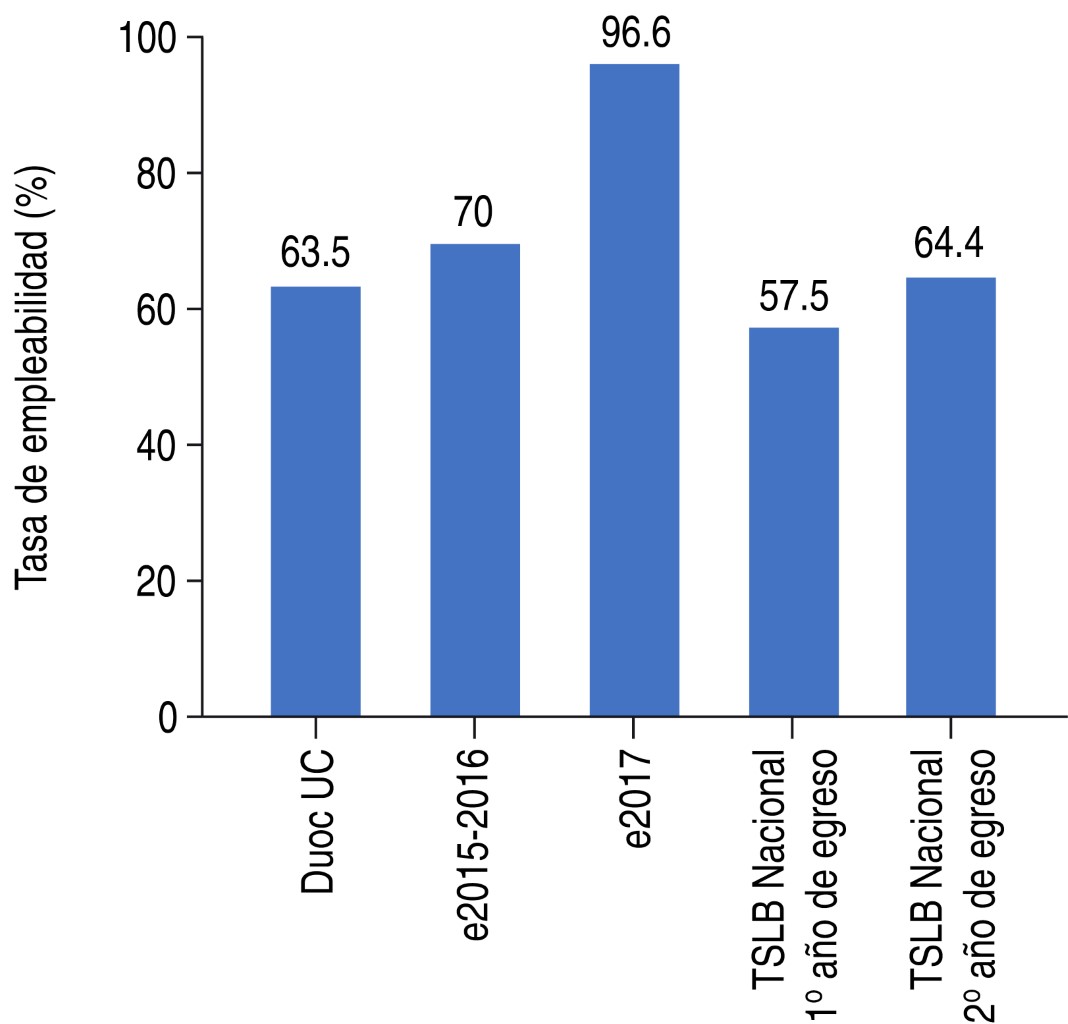 Para el nivel IV Kirkpatrick los estudiantes tuvieron seis meses para encontrar trabajo directamente relacionado a TSLB. Es por lo que los estudiantes que trabajan en áreas no relacionadas, o que ingresaron a planes de estudio profesionales, no contribuyen al campo "trabajo directo". Así, de los datos se desprende que e2015-2016 (n = 40) y e2017 (n = 29) se encuentran por sobre la media TSLB nacional del año 2017, con un 70 y 96.6% respectivamente (Figura 4). Más aún, los valores de ambos grupos son superiores a la tasa de empleabilidad promedio anual de TSLB Duoc UC.