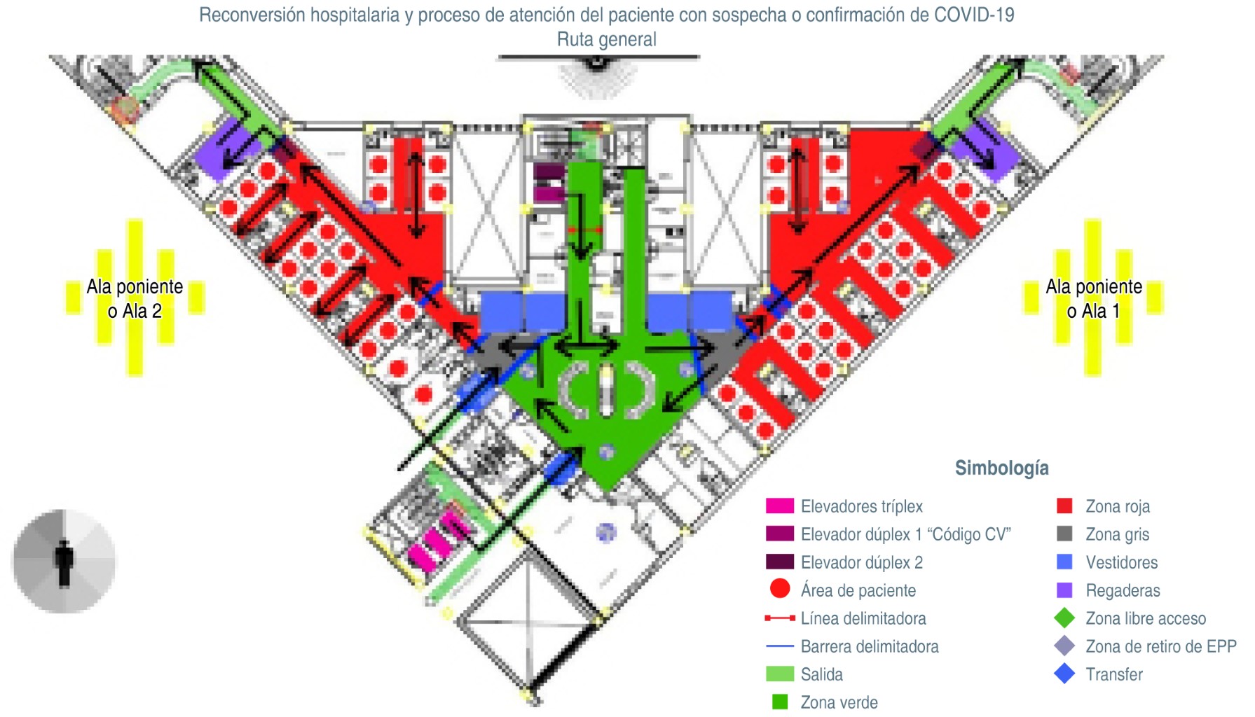 Aprovechando la estructura hospitalaria se determinó separar las dos alas aislándolas completamente una de la otra, lo cual permitió que el área central sirviera para trabajo de enfermería y médicos; fue necesario equipar el área central con máquinas de computación para trabajo y visualización de imágenes.
