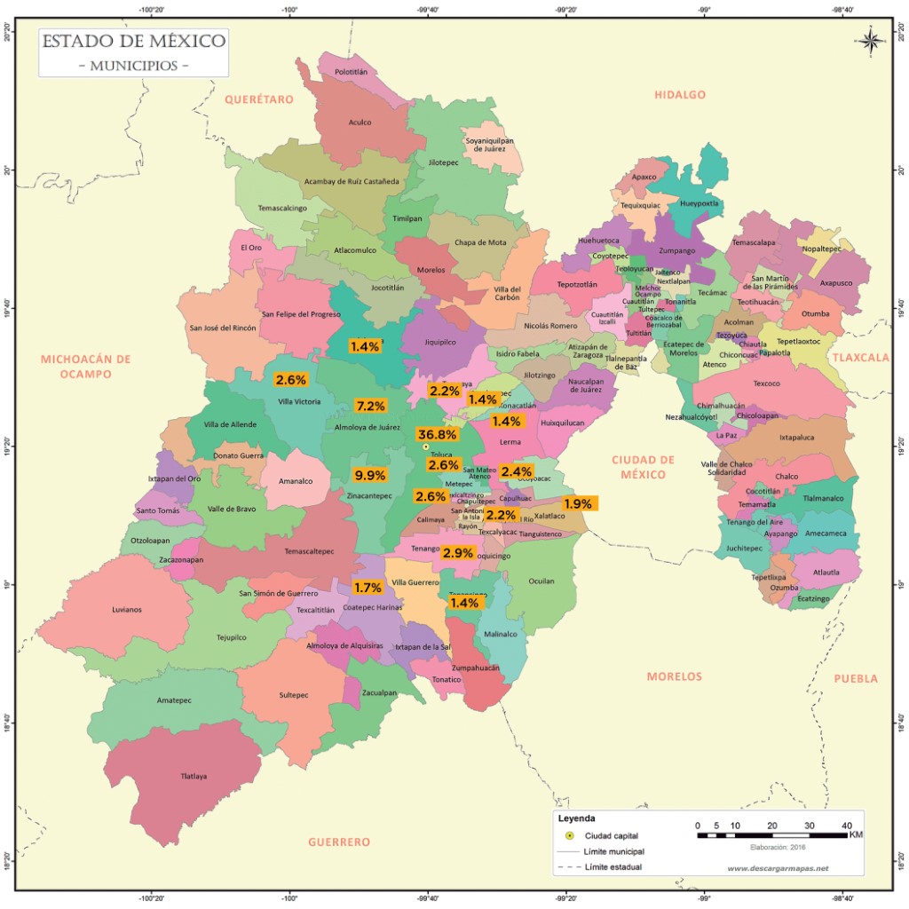 En cuanto al lugar de origen, 36.8% de los pacientes eran del municipio de Toluca (153 pacientes), 9.9% (41 pacientes) de Zinacantepec, 7.2% (30 pacientes) de Almoloya de Juárez, 2.9% (12 pacientes) de Tenango del Valle, 2.6% (11 pacientes) de Calimaya, 2.6% (11 pacientes) de Metepec, 2.6% (11 pacientes) de Villa Victoria, 2.4% (10 pacientes) de San Mateo Atenco, 2.2% (nueve pacientes) de Santiago Tianguistenco de Galeana, 2.2% (nueve pacientes) de Temoaya, 1.9% (ocho pacientes) de Xalatlaco, 1.7% (siete pacientes) de Coatepec de Harinas, 1.4% (seis pacientes) de Ixtlahuaca, 1.4% (seis pacientes) de Lerma, 1.4% (seis pacientes) de Otzolotepec, 1.4% (seis pacientes) de Tenancingo, y 1.9% (80 pacientes) vinieron de otros municipios del Estado de México así como de otros estados vecinos tales como Guerrero, Michoacán, Morelos y la Ciudad de México (Figura 1).11