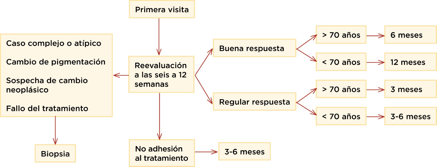 En el estudio de Renaud-Vilmer C et al. se reevaluó a la paciente después de las primeras seis a 12 semanas de tratamiento. Una buena respuesta está indicada por el alivio del prurito y el dolor y la resolución de la hiperqueratosis, las fisuras y las equimosis. Si los síntomas reaparecen durante o después de la disminución gradual, la frecuencia de la intervención aumenta hasta que haya una mejoría clínica satisfactoria. Si la paciente no está dispuesta a realizar una terapia de mantenimiento, se la examina cada tres a seis meses, porque la recurrencia asintomática que produce cicatrices y pérdida de arquitectura puede ocurrir en un período de tiempo relativamente corto.1,41