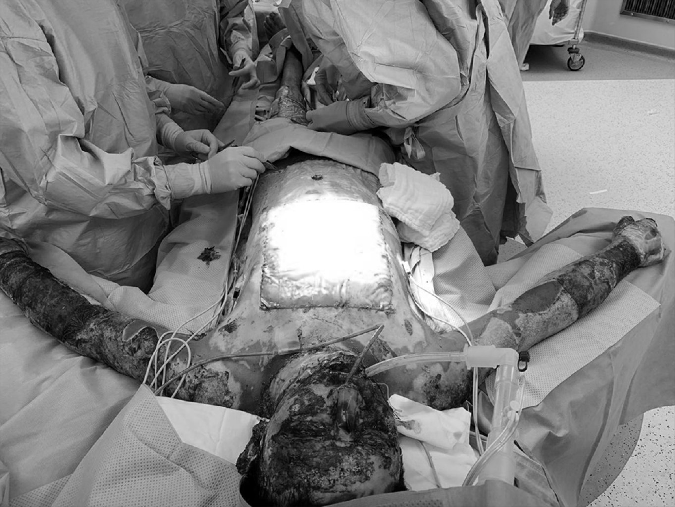 Paciente masculino de 17 años de edad sin antecedentes de importancia ni heredofamiliares según interrogatorio indirecto hacia paramédico. El paciente se encuentra en el Área de Terapia Intensiva del Centro Médico ABC con quemaduras de tercer grado en 80% del ASC clasificándose como gran quemado con 10 horas de evolución. Se programa para lavado quirúrgico y fasciotomía de miembros torácicos.